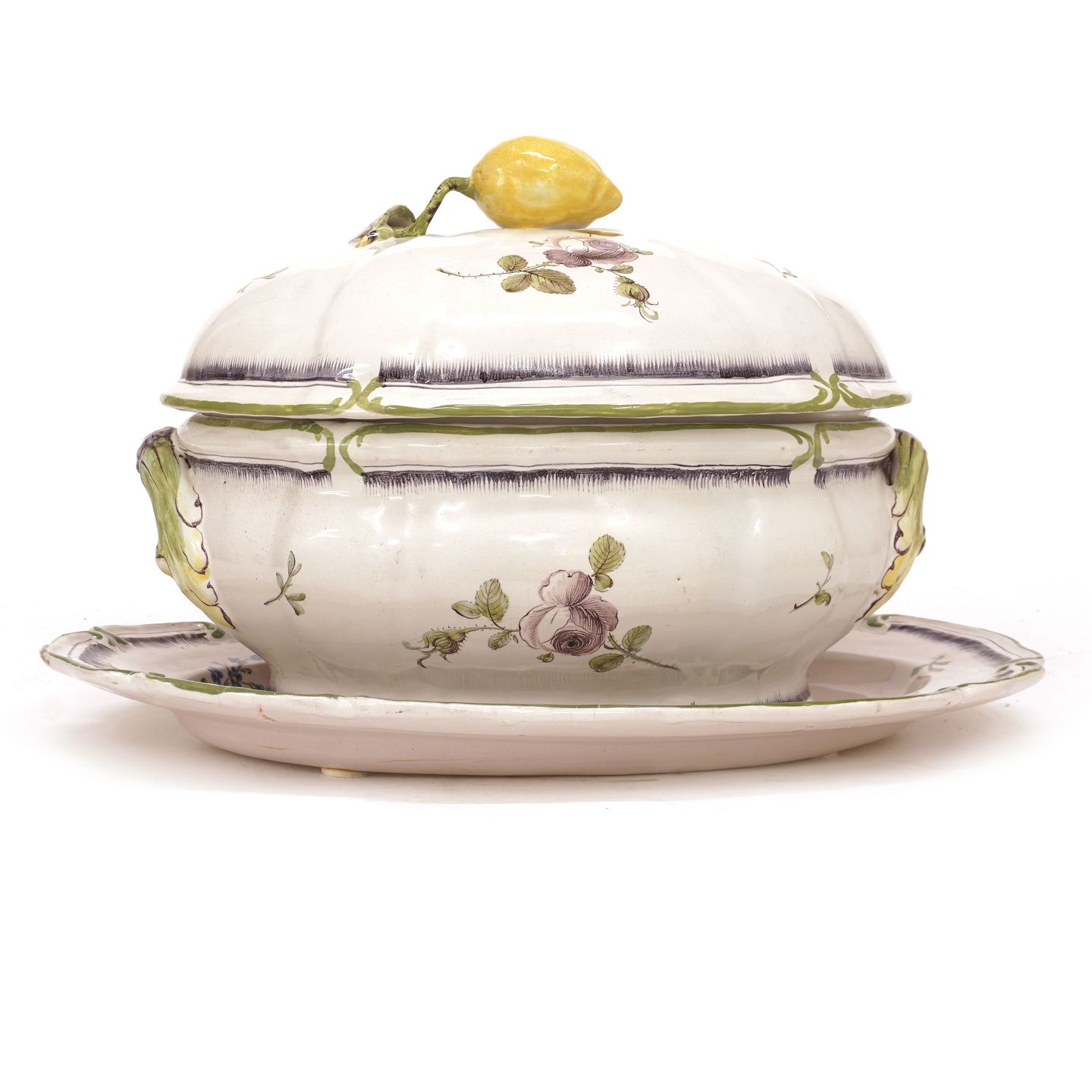 Polychrome decorated faience tureen Stralsund circa 1770 L plate: 41cm. H: 24cm Item number: 34296