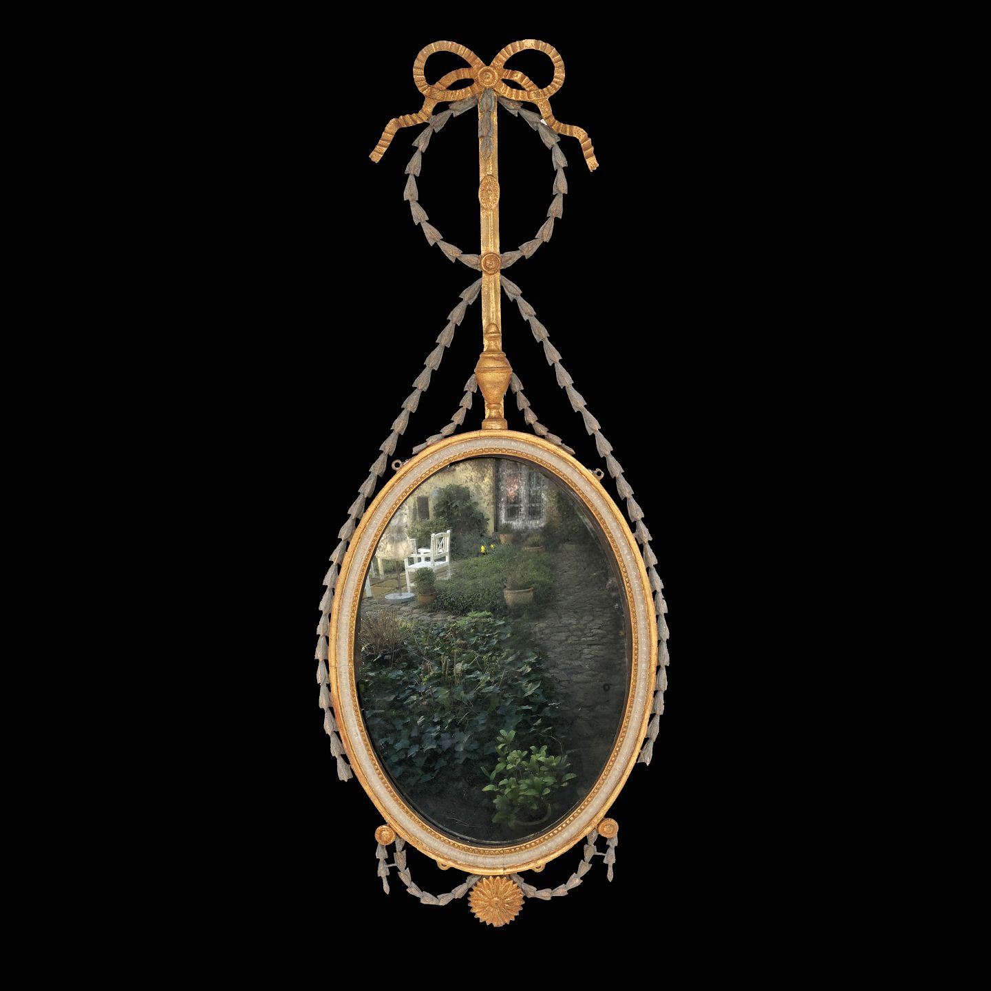 Ovaler, reich dekorierter Spiegel. Dänemark um 1790. H: 116cm. B: 47cm