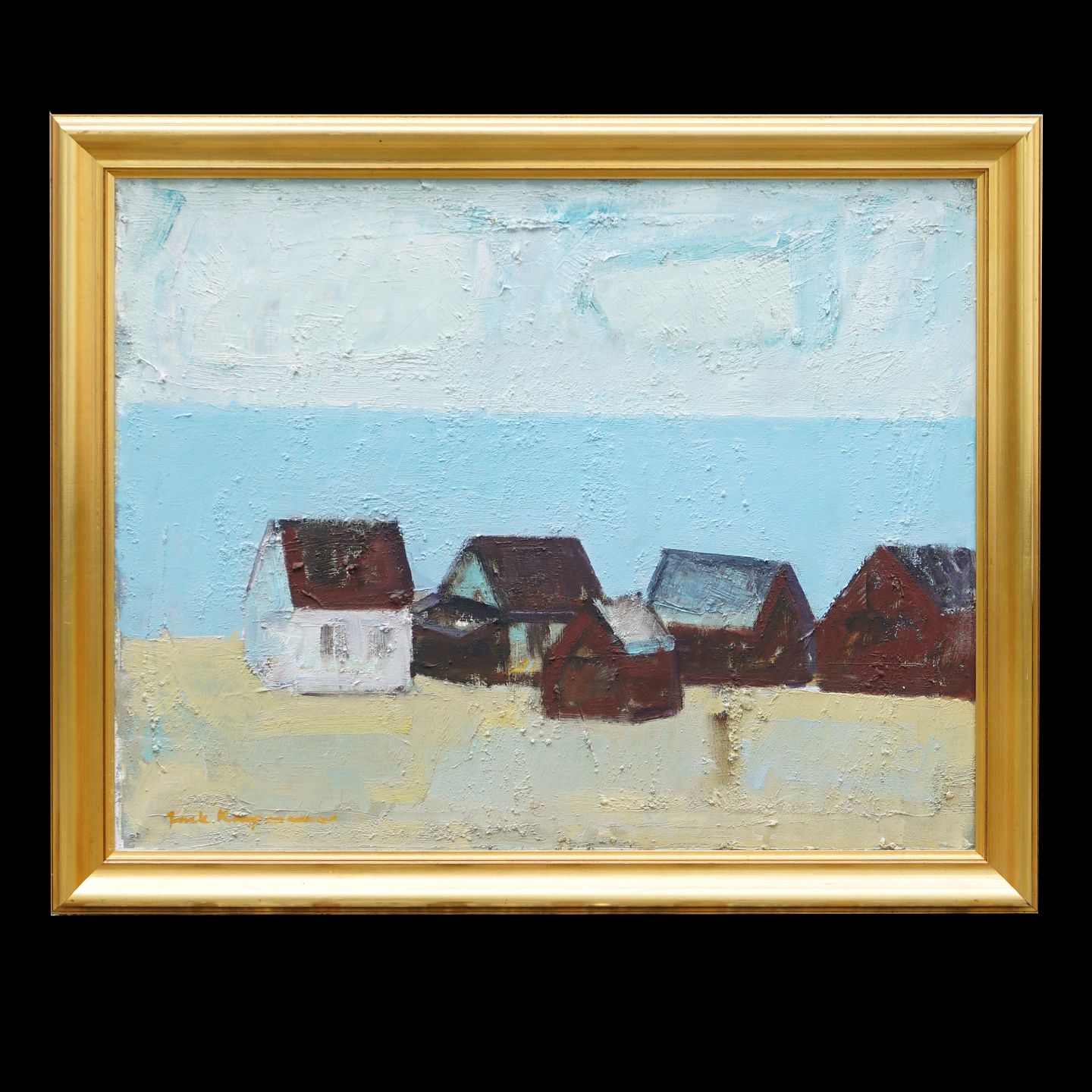 Jack Kampmann maleri Færøerne. Jack Kampmann, 1914-89, olie på lærred. Motiv fra bygd på Færøerne. Signeret. Lysmål: 64x80cm. Med ramme: 76x92cm