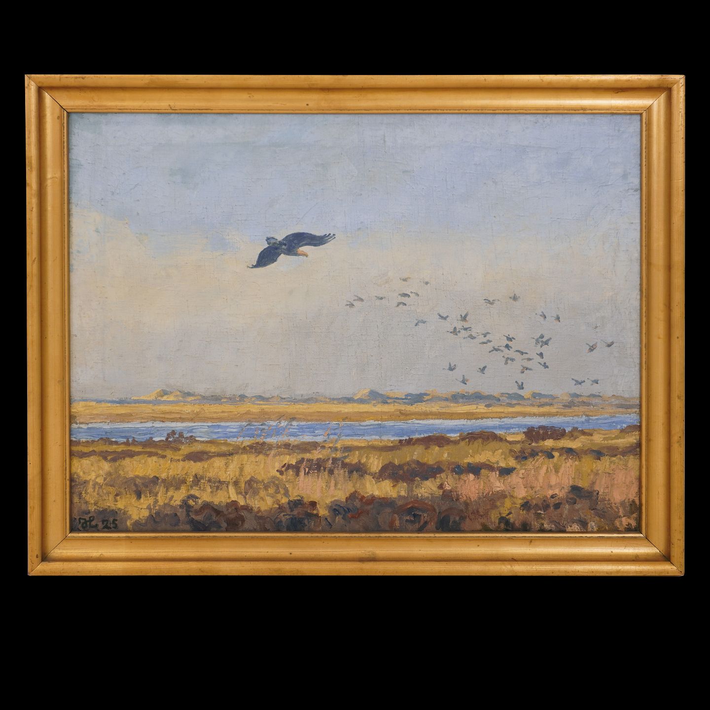 Johannes Larsen maleri. Johannes Larsen, 1867-1961, olie på lærred. Motiv i form af ørn og fugleflok i flugt. Signeret Johannes Larsen og dateret 1925. Lysmål: 59x78cm. Med ramme: 69x88cm