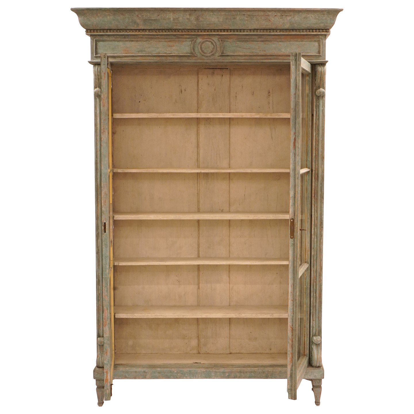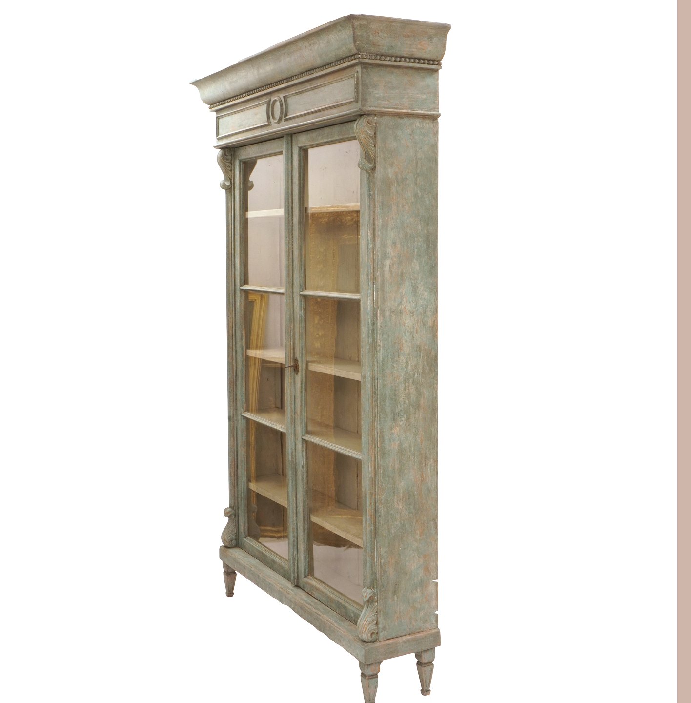 Light grey/green decorated display cabinet around 1850. H: 213cm. W: 139cm. D: 36cm (top) / 25cm