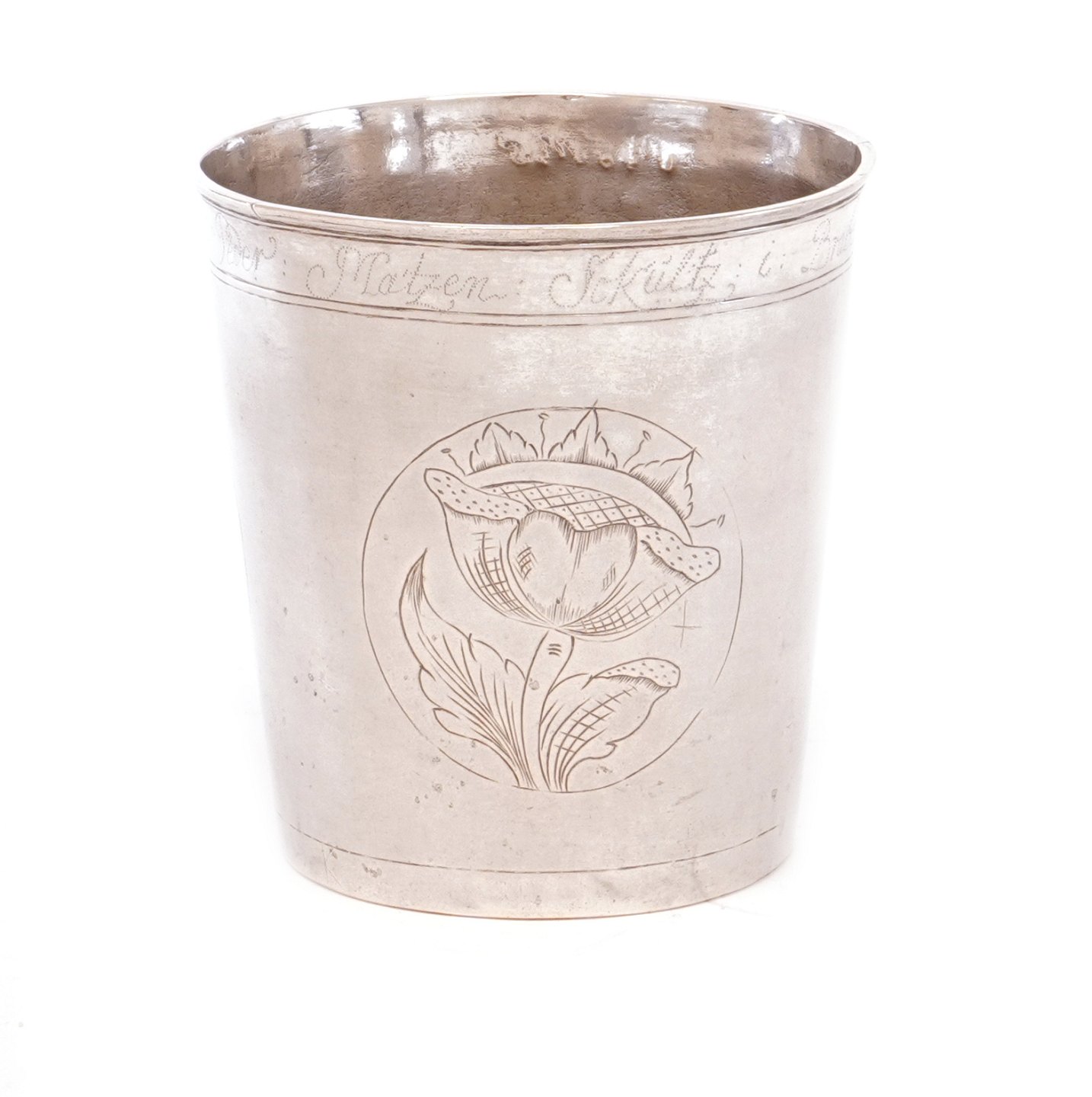 Barokt sølvbæger med dekoration i form af tre kartoucher med stiliserede blomster. Mester Wolf Petersen, Haderslev, 1746-63. H: 8,4cm