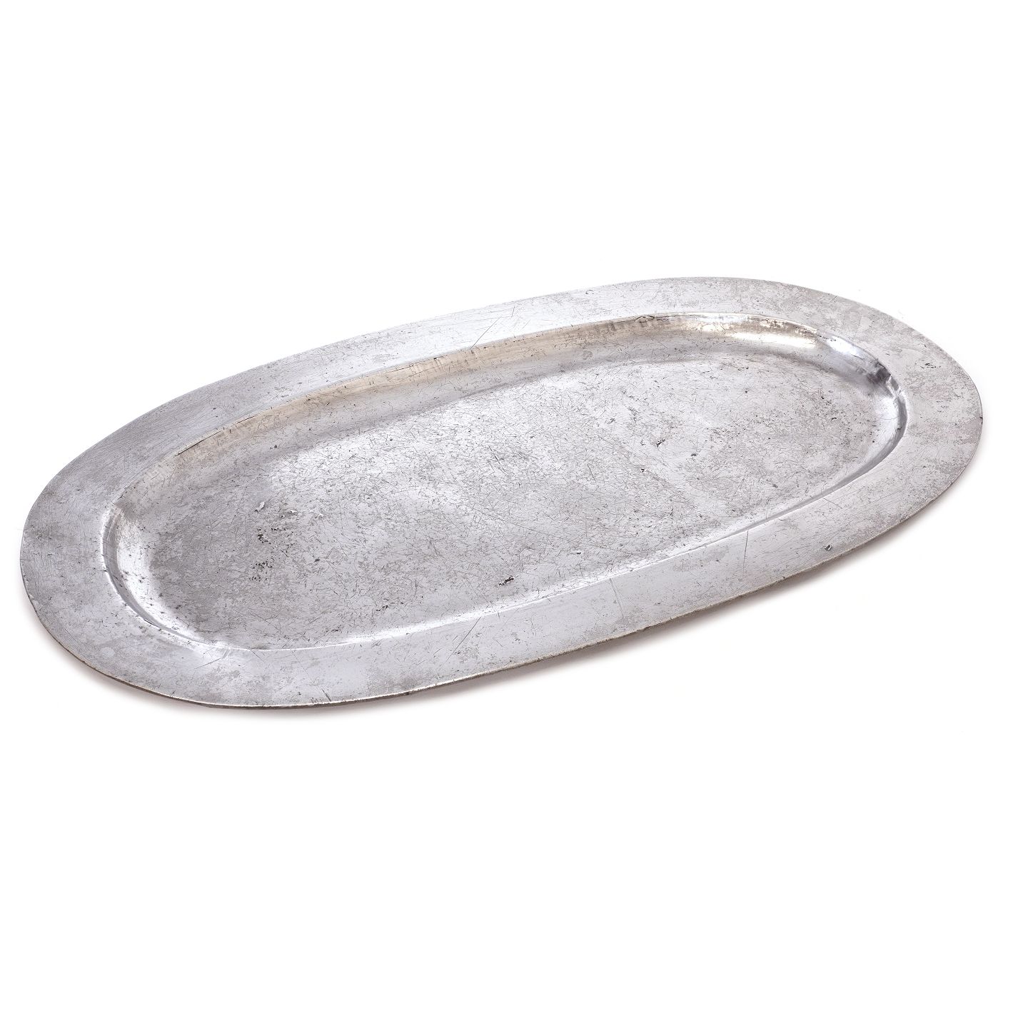 Tidligt og stort ovalt dyrerygsfad i tin udført af Friedrich Friedrich, København, 1747-1797, ca. år 1780. Mål: 77x43cm