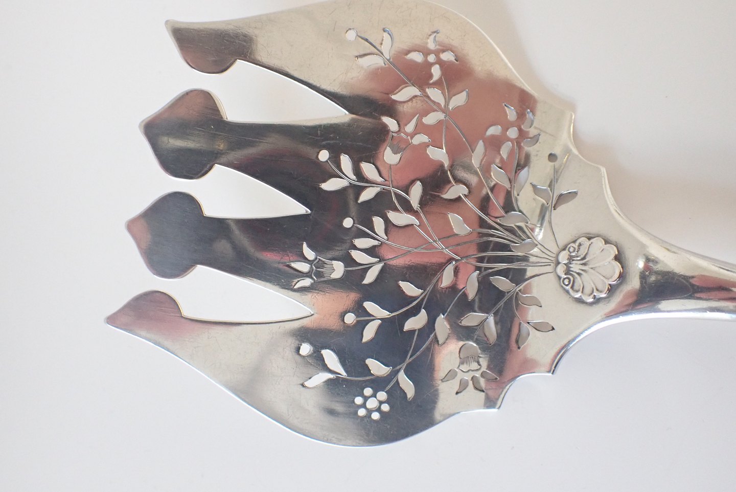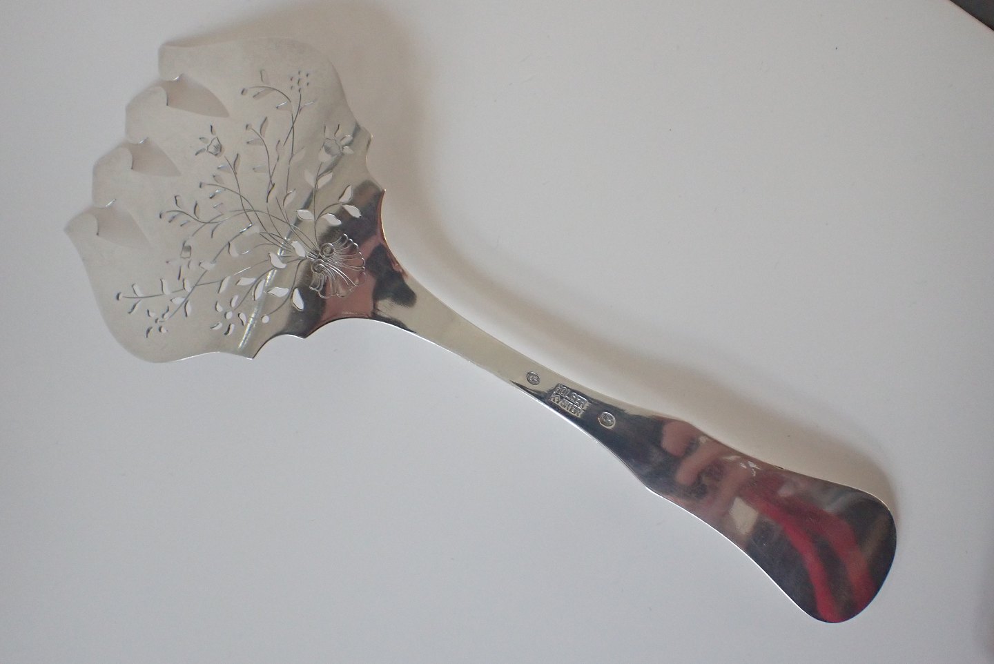 Holger Kyster (1898 - 1944) - fiskespade i 825 sølv med perforeret og påsat blomstermotiv. Stemplet Holger Kyster og 2 gange fuglen fra Kolding byvåben. Vægt 106 gram. Længde: 23,2 cm.