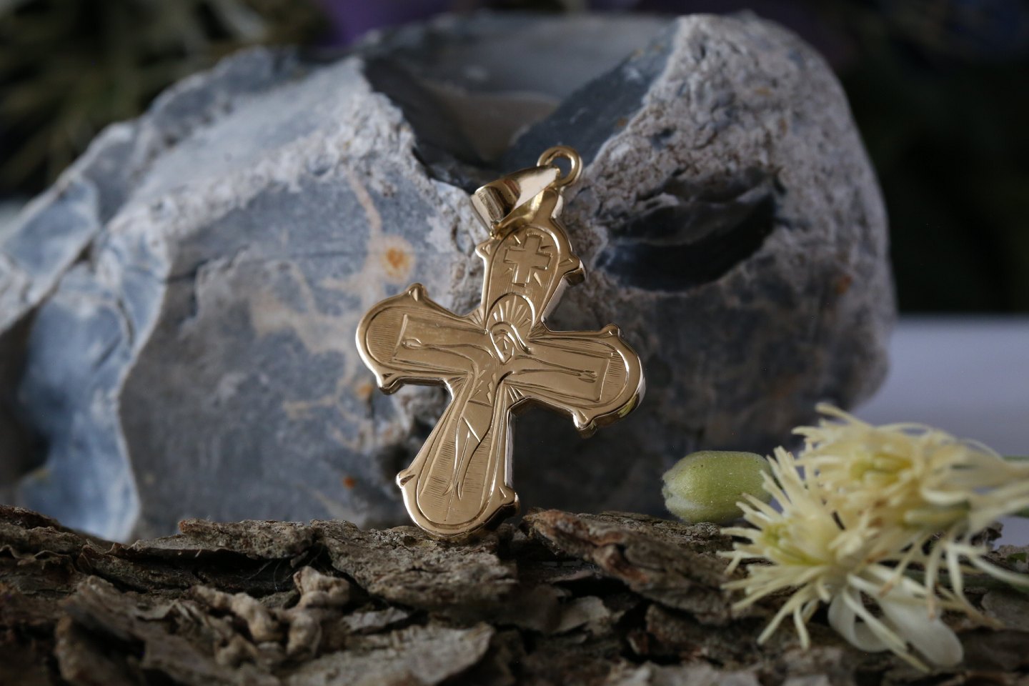 Gold cross in 14 carat gold for necklace. Classic pendant.