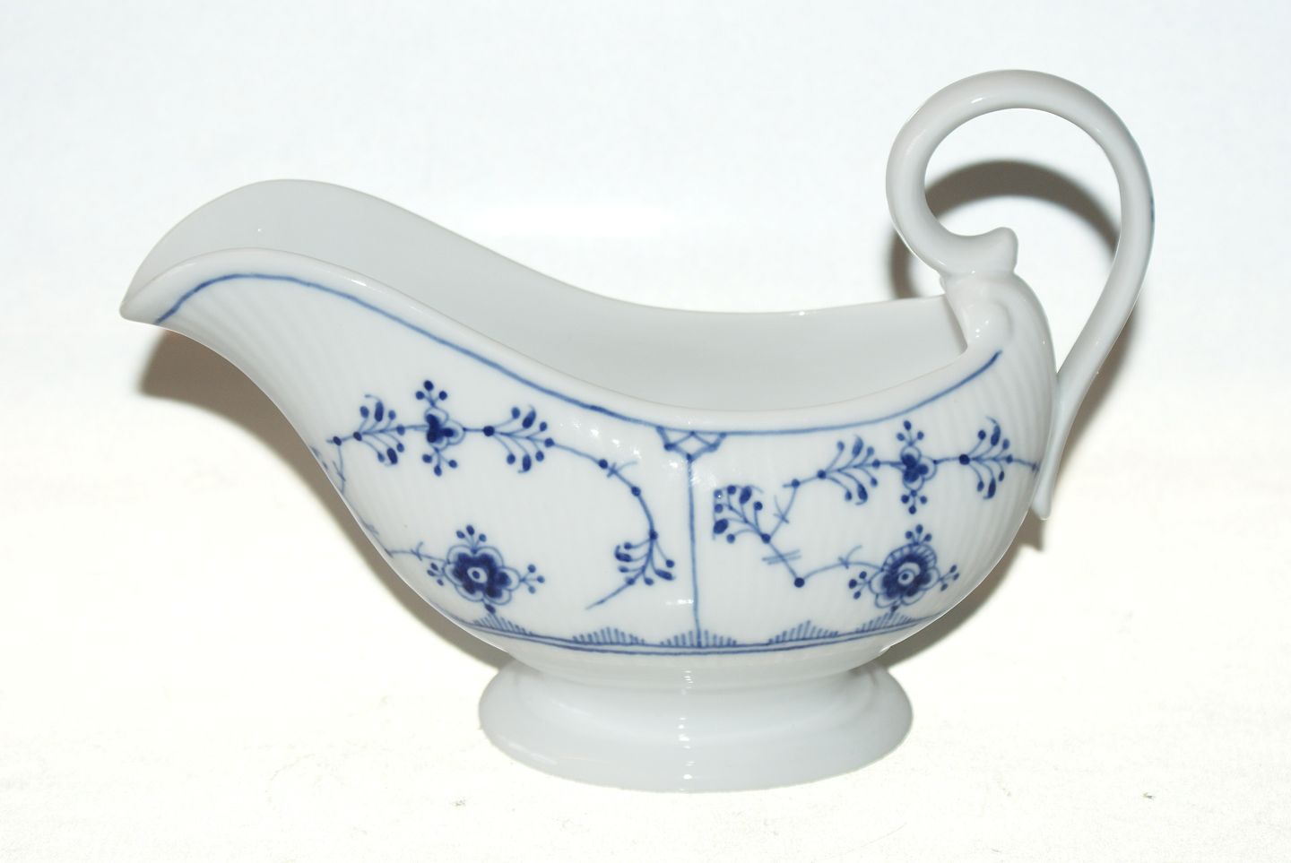 Kongelig Musselmalet Riflet, Sauceskål Produceret 1850-1898 Dekorationsnummer 1/406 1.Sortering Højde 13,5 cm. Længde 20 cm. Perfekt stand.