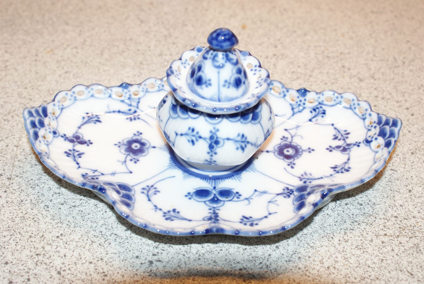 Kongelig Musselmalet Helblonde, Skrivetøj med fast blækhuse Produceret mellem 1898-1922 Dek. nr. 1/1064 1.Sortering Måler 17 x 10 cm. Flot og velholdt.