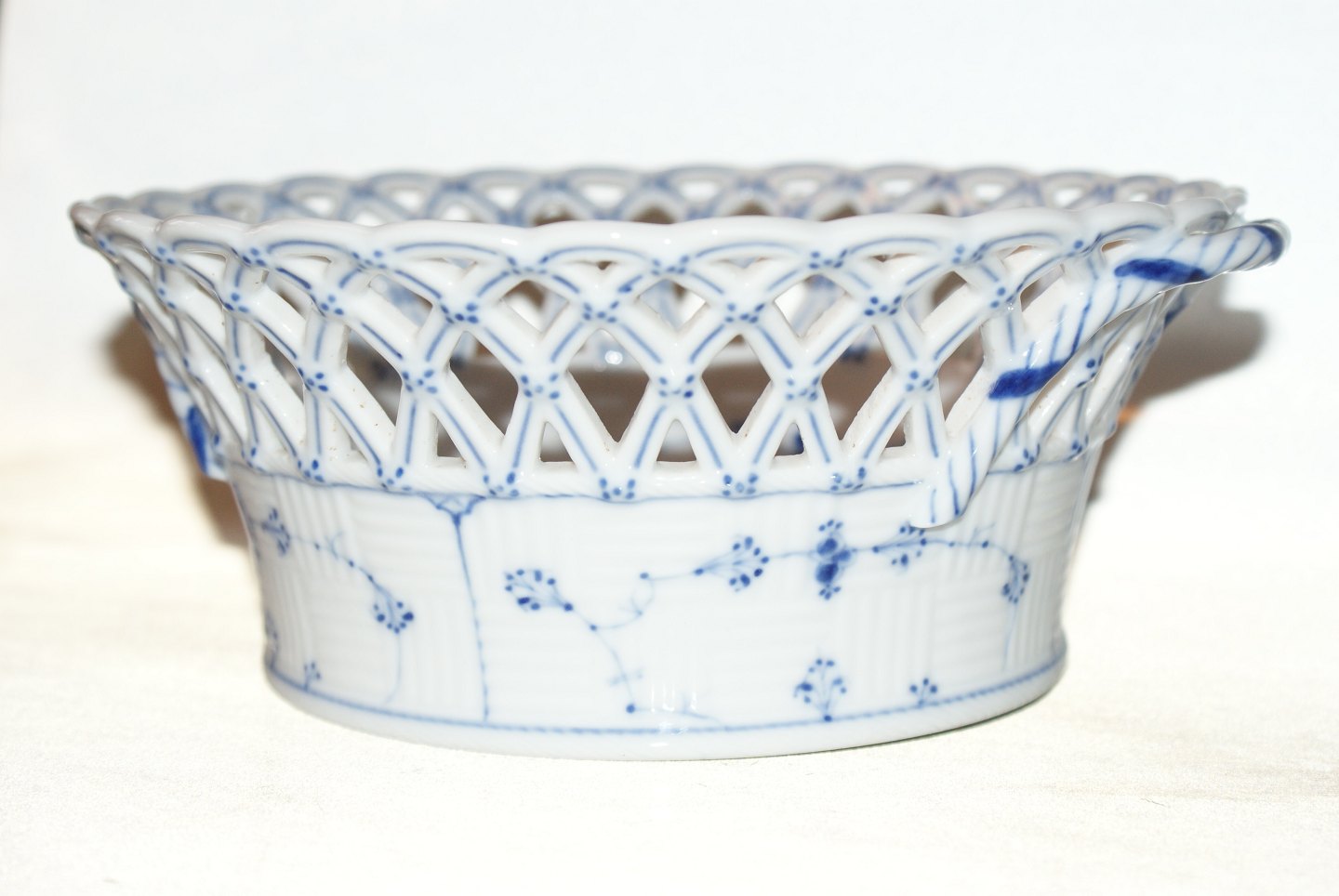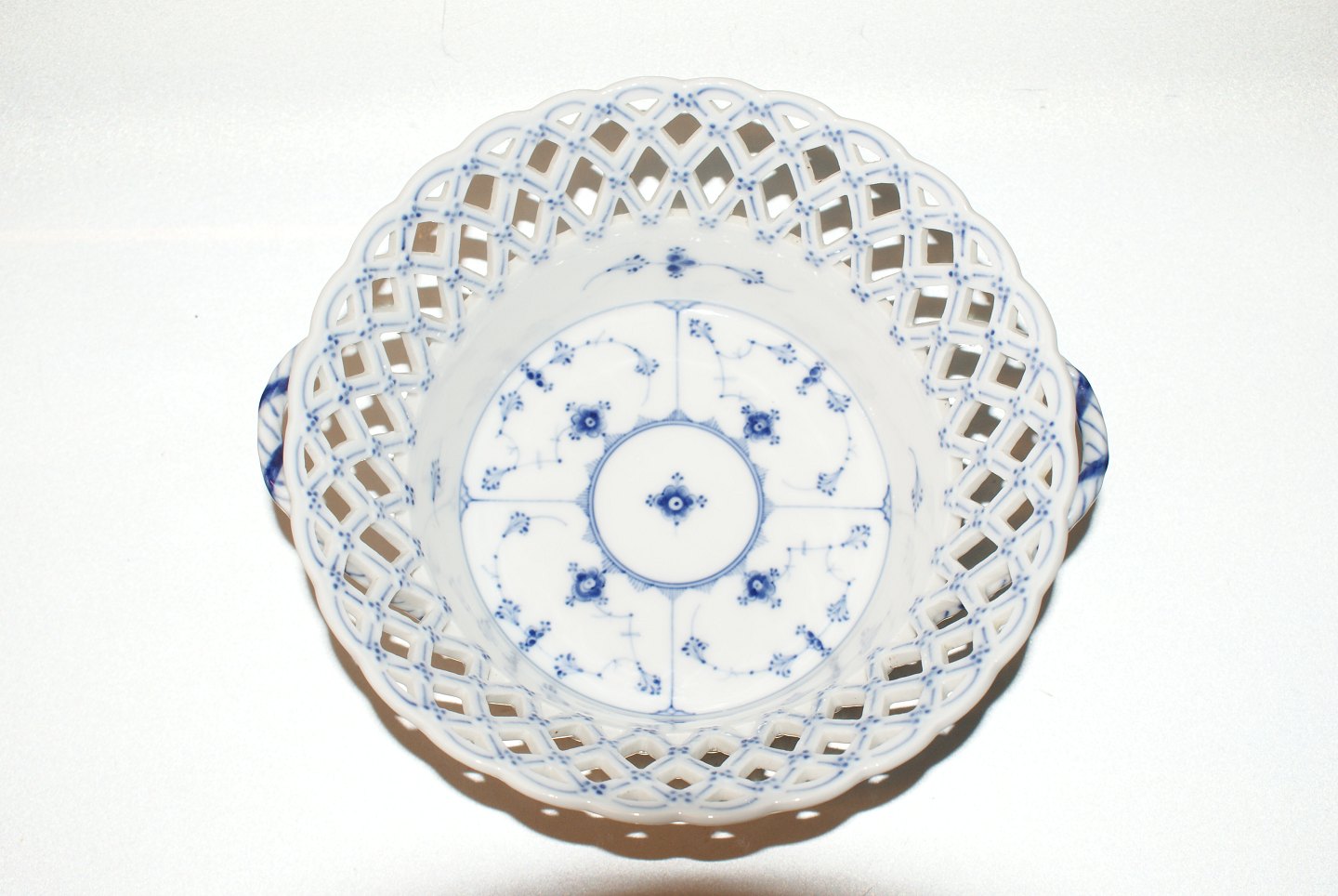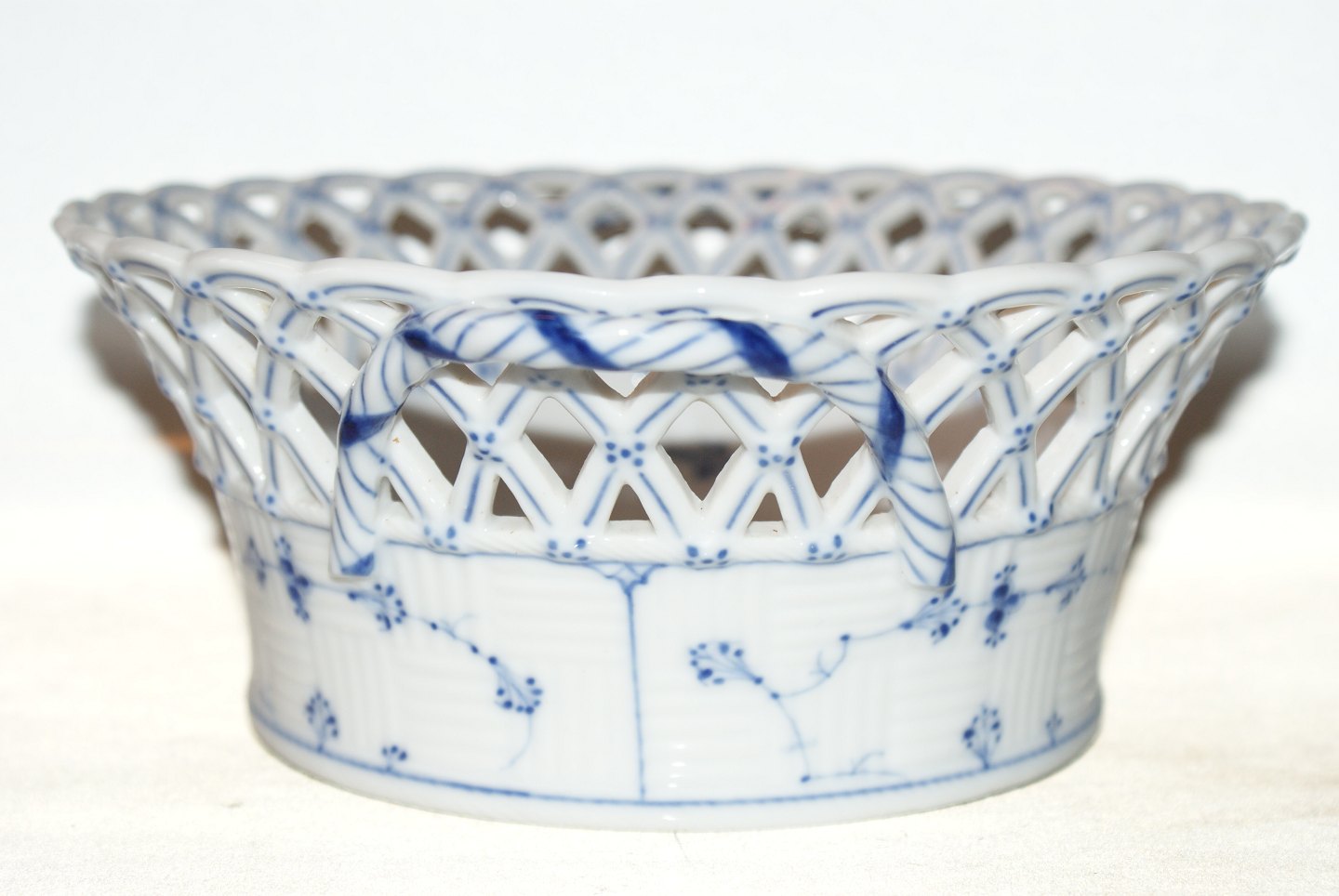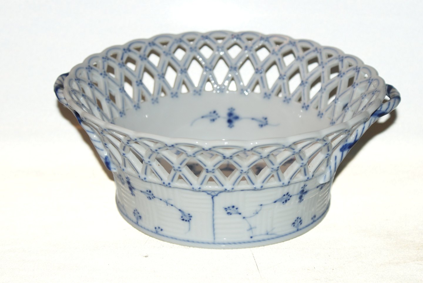 Kongelig Musselmalet Helblonde, Frugtkurv, rund. Produceret sidste halvdel 1800 tallet Dekorationsnummer 1/1052 1.Sortering Diameter 21,5 cm. Højde 9 cm. Flot og velholdt stand.