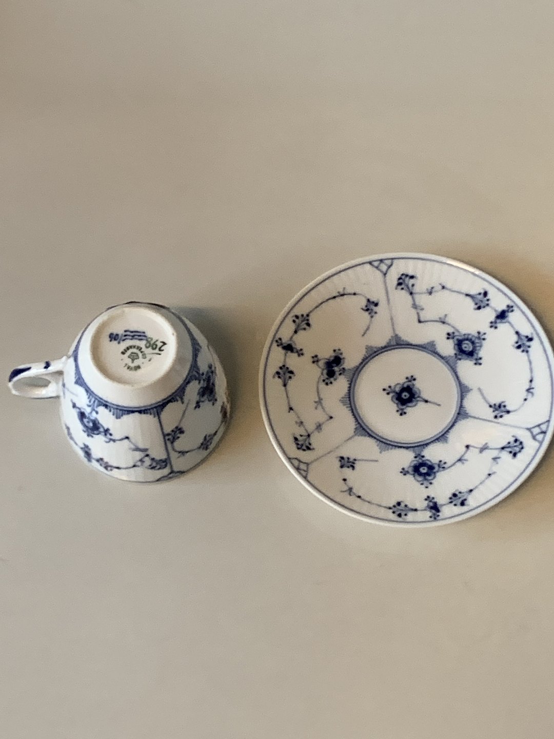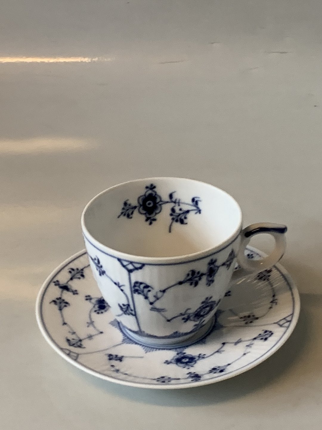 Royal Copenhagen Blue Fluted #Riflet, Mocha cup and saucer with flower
