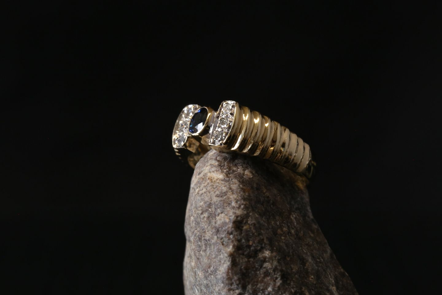 Gold ring with inlaid brilliants, and blue sapphire on top. This is therefore a very high quality ring, with many beautiful details in the design. The diamonds on the edge of the case provide a nice contrast to the blue sapphire on top.