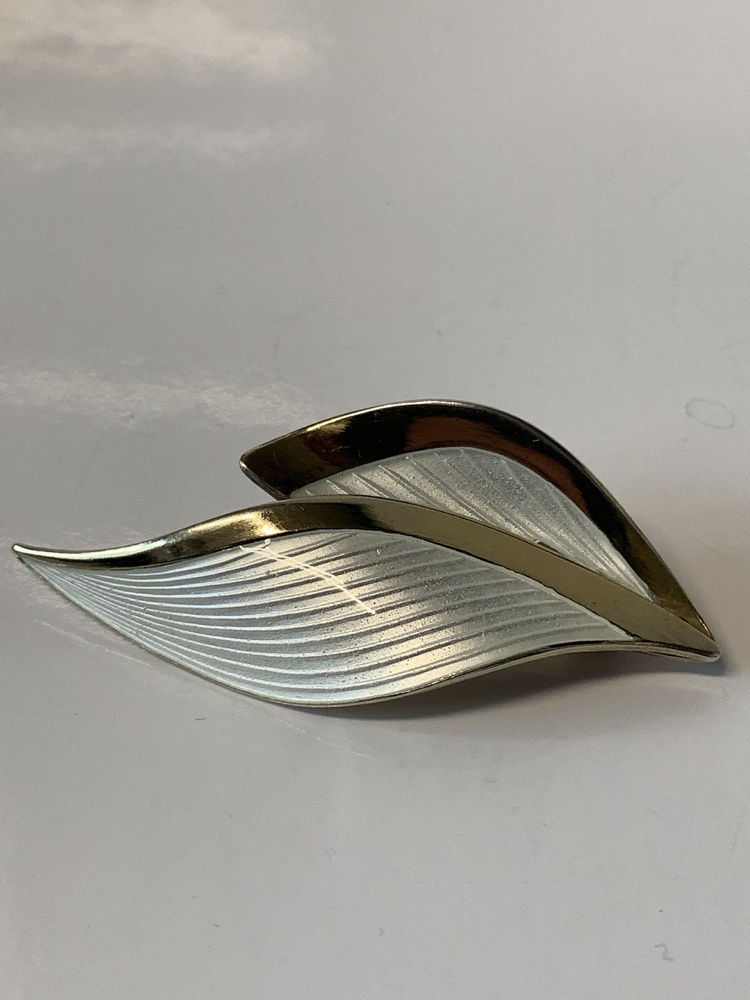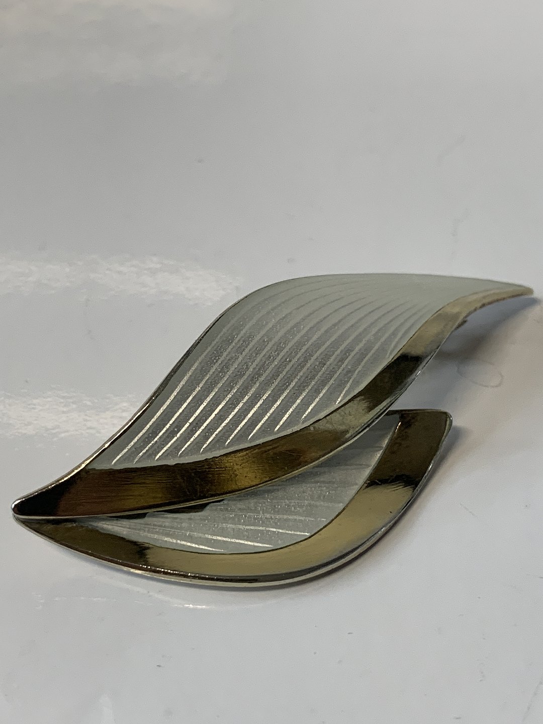 Smuk broche formet som to blade, der er belagt med hvid emalje. De bløde linjer giver brochen et organisk træk, som giver liv til brochen. På hvert blad er linjer, der forstærker bladformen og samtidig giver kontrast i emaljen. Denne broche er meget flot, og vil især være egnet til mørke farver. Brug den til en flot kjole eller bluse, så vil du med garanti være festens midtpunkt.