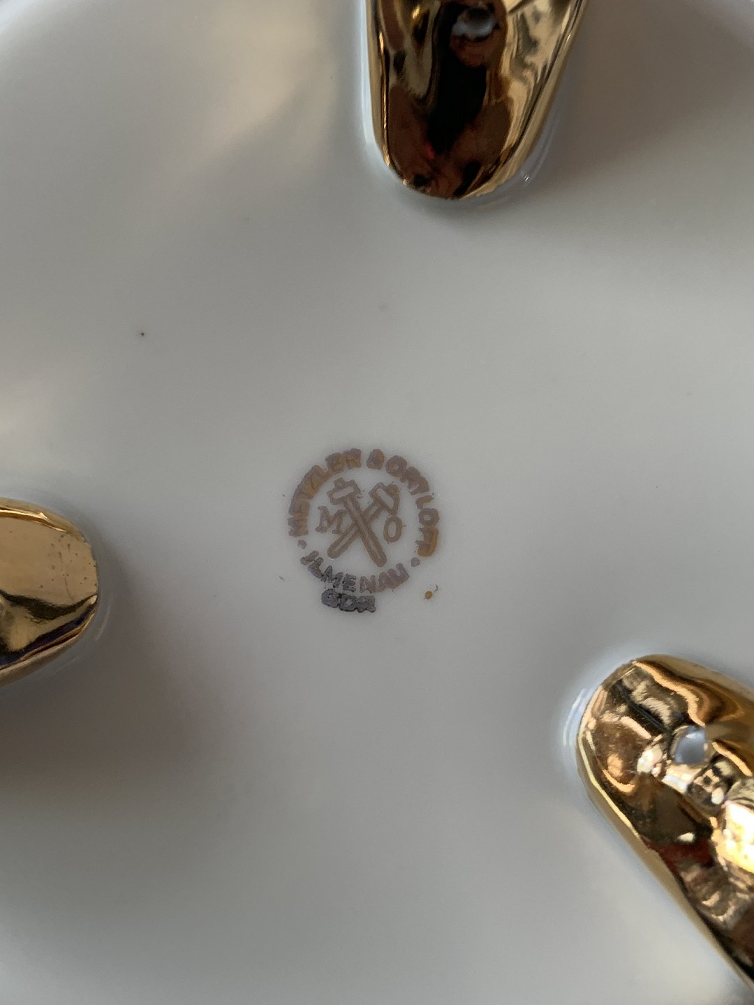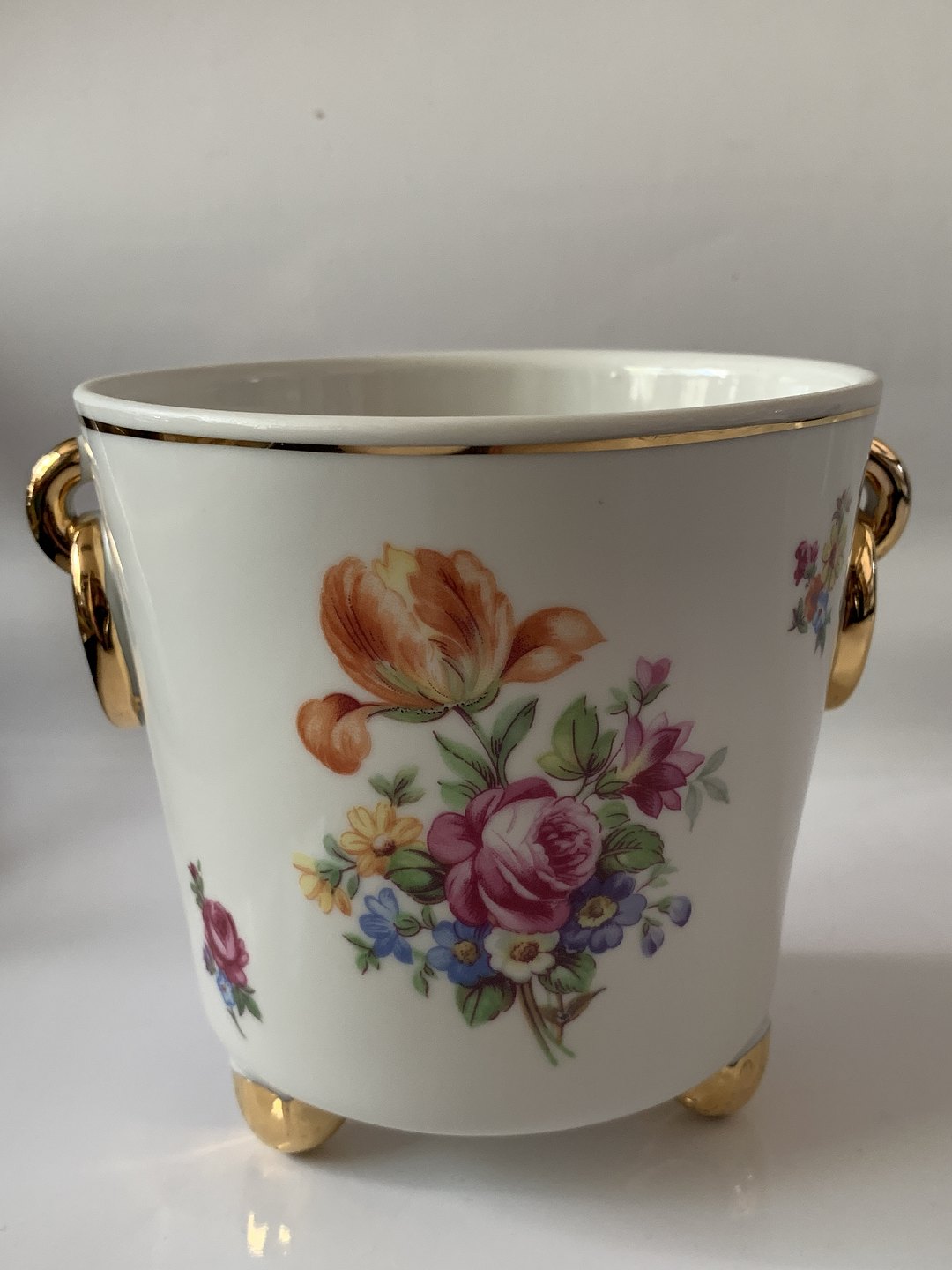 Urtepotteskjuler med blomstermotiv / 3 fødder. Diameter indvendige mål 10,5 cm. Højde 11 cm. Velholdt stand.