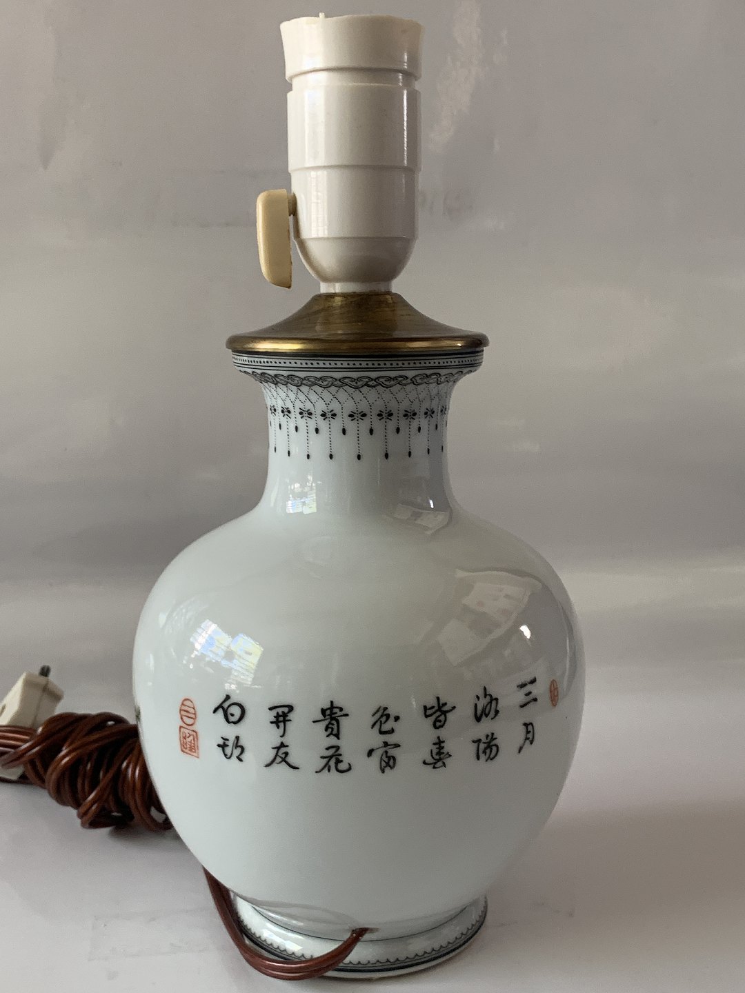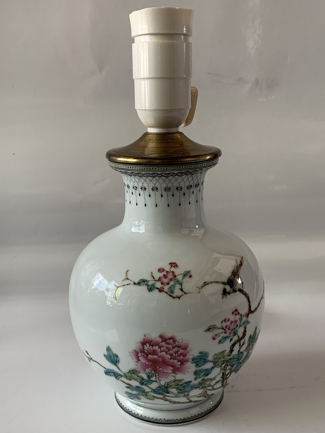 Kinesisk bordlampe i porcelæn med messing top og fatning med fugle