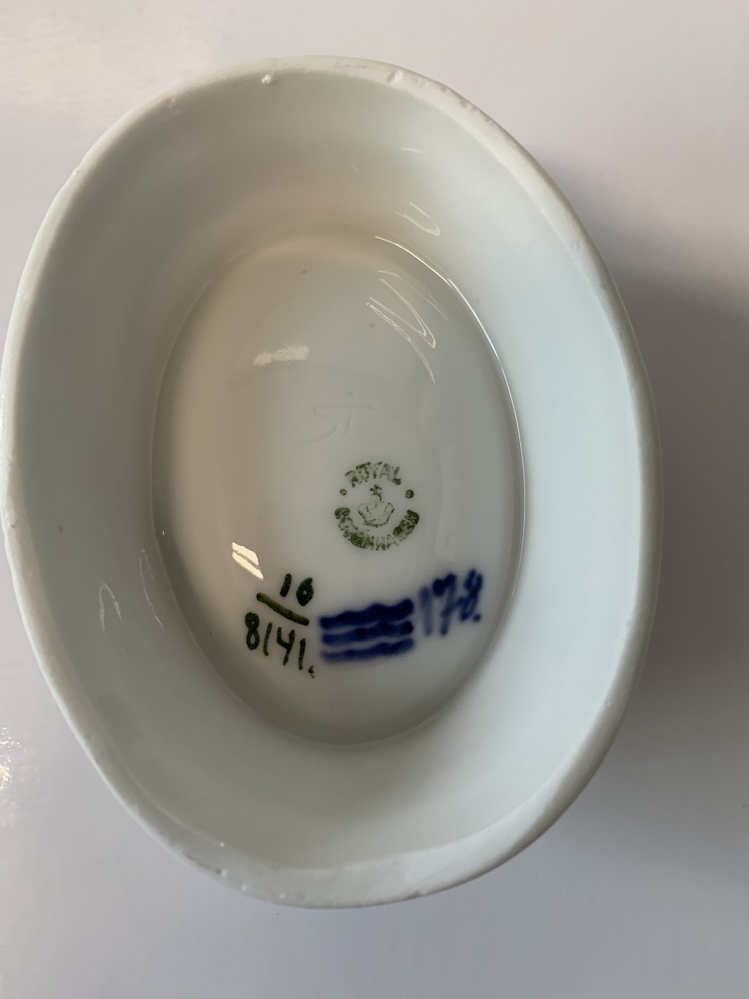 Royal Copenhagen Blå Blomst Flettet, oval saltkar. Dekorationsnummer 10/8141. Fabriksmærket viser, at denne er produceret mellem 1998-1922. 1. sortering. H: 3,5cm. L: 8,3cm. B: 6,3cm. Flot og velholdt stand