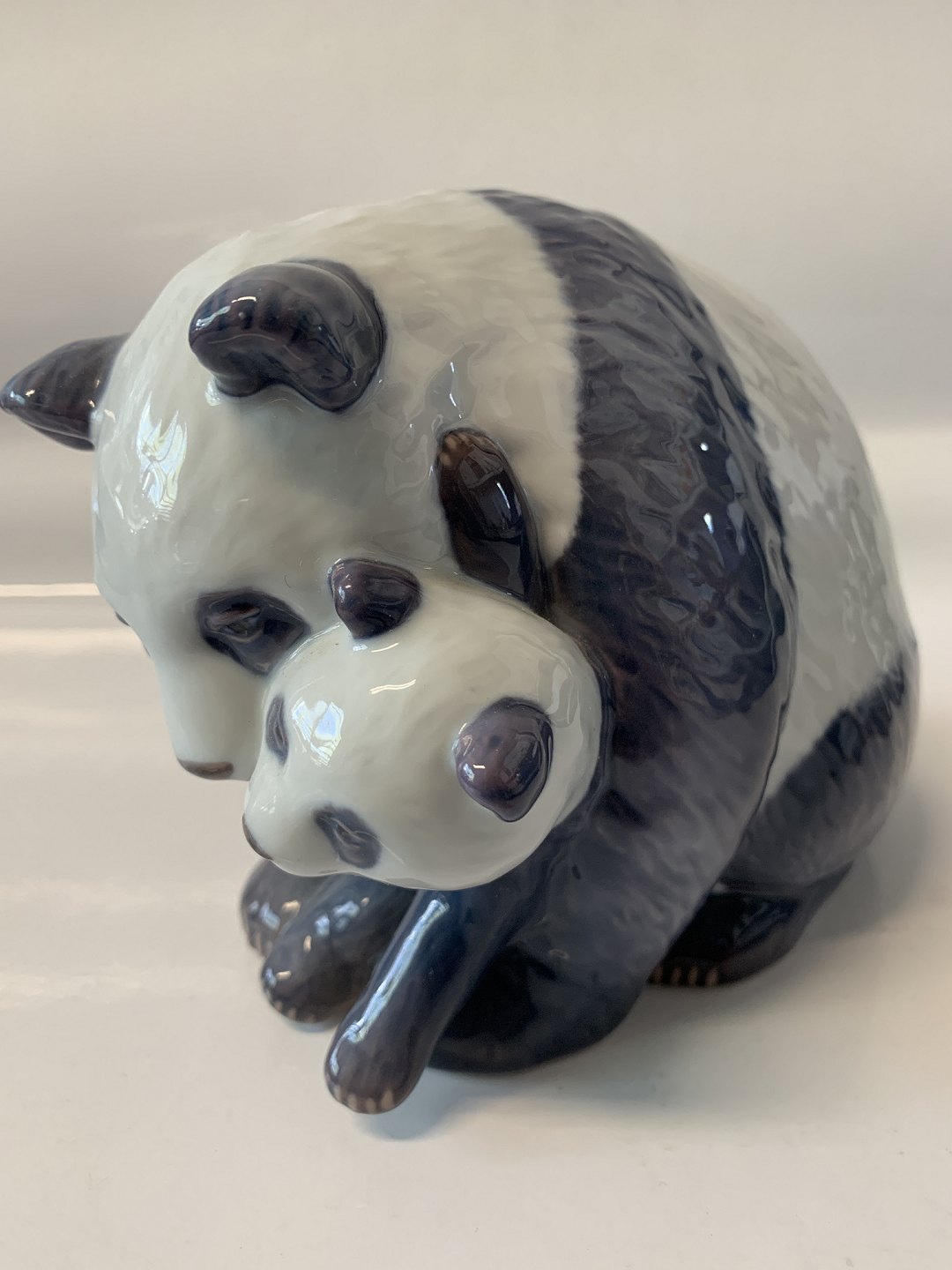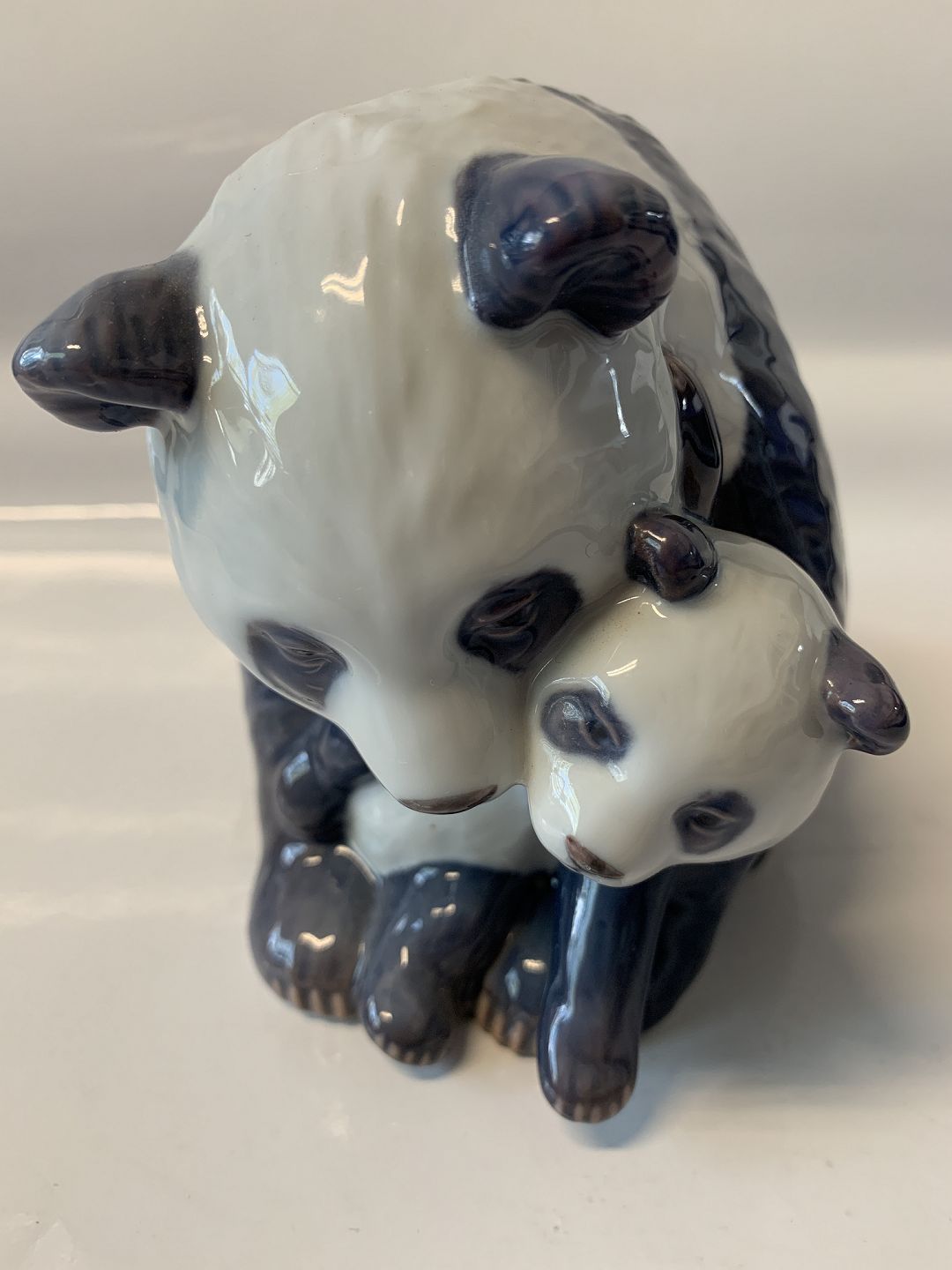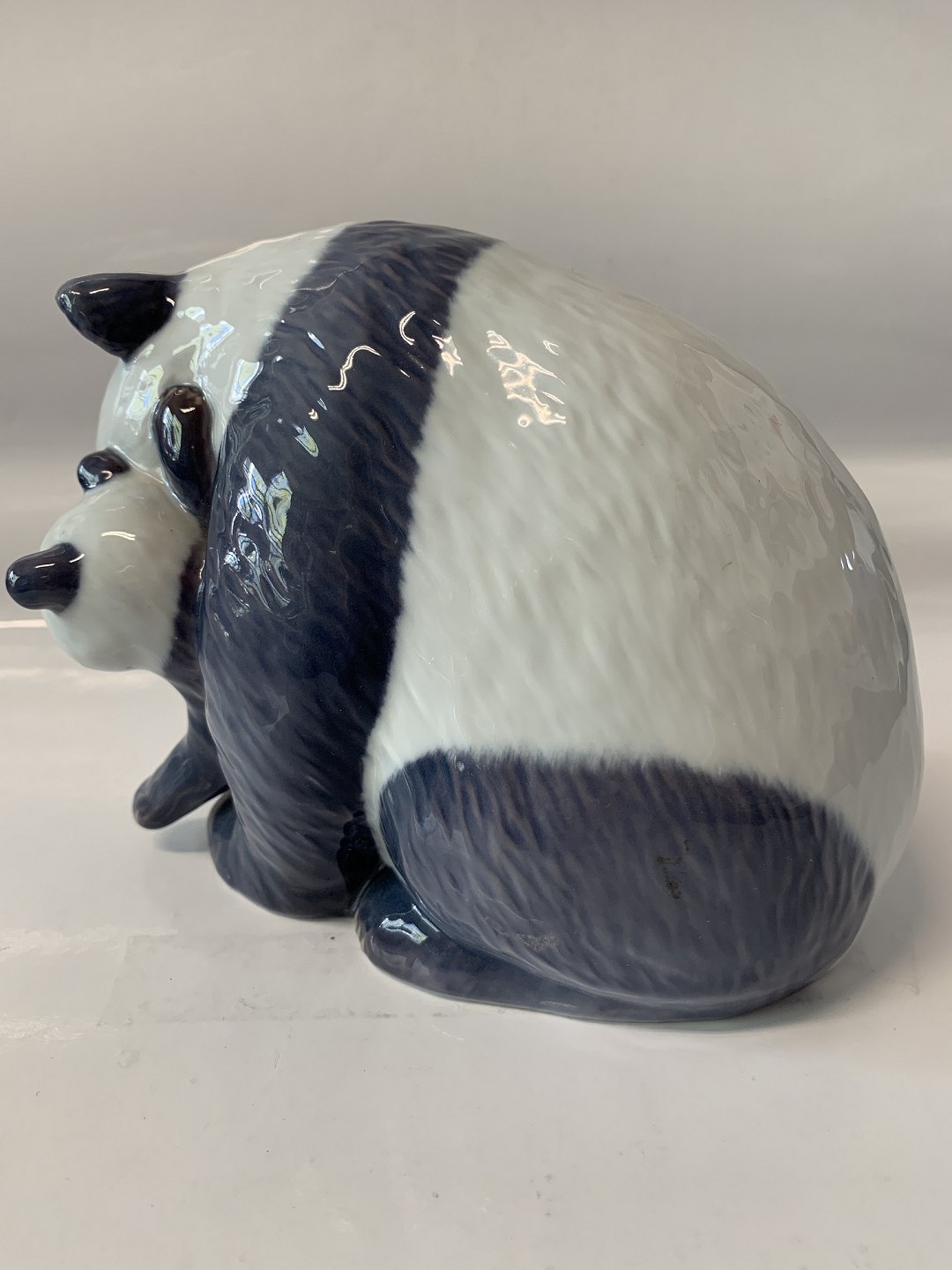 Royal Copenhagen Figur, Pandabjørn med unge. Længde 17 cm. Højde 13 cm. Dekorationsnummer 666. 2. sortering. Pæn og velholdt stand.