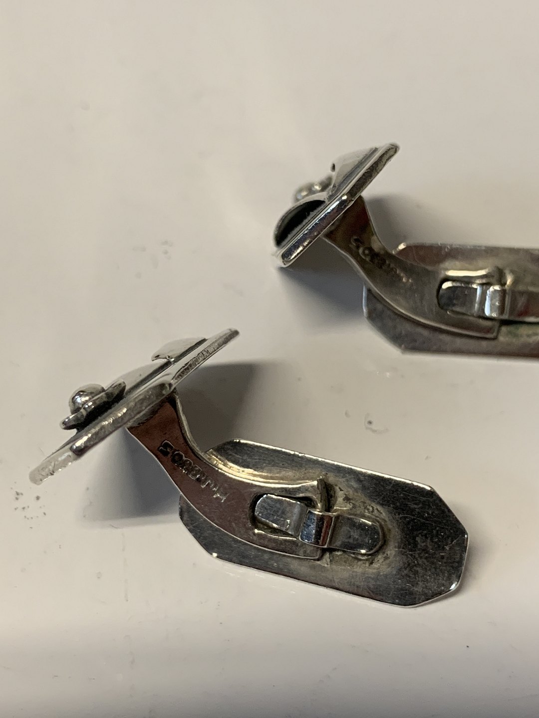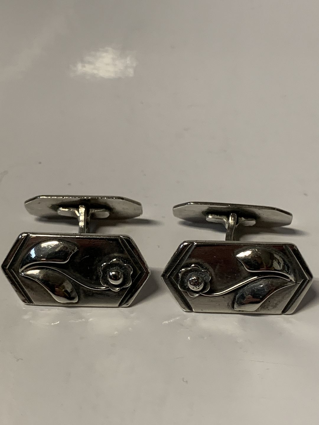 Manchetknapper i sølv Stemplet H.J. 830s Højde 12,45 mm Længde 24,30 mm Se desuden vores store udvalg af smykker hos antikhuset her: https://www.antikhuset.net/katindex.asp?kukat=597