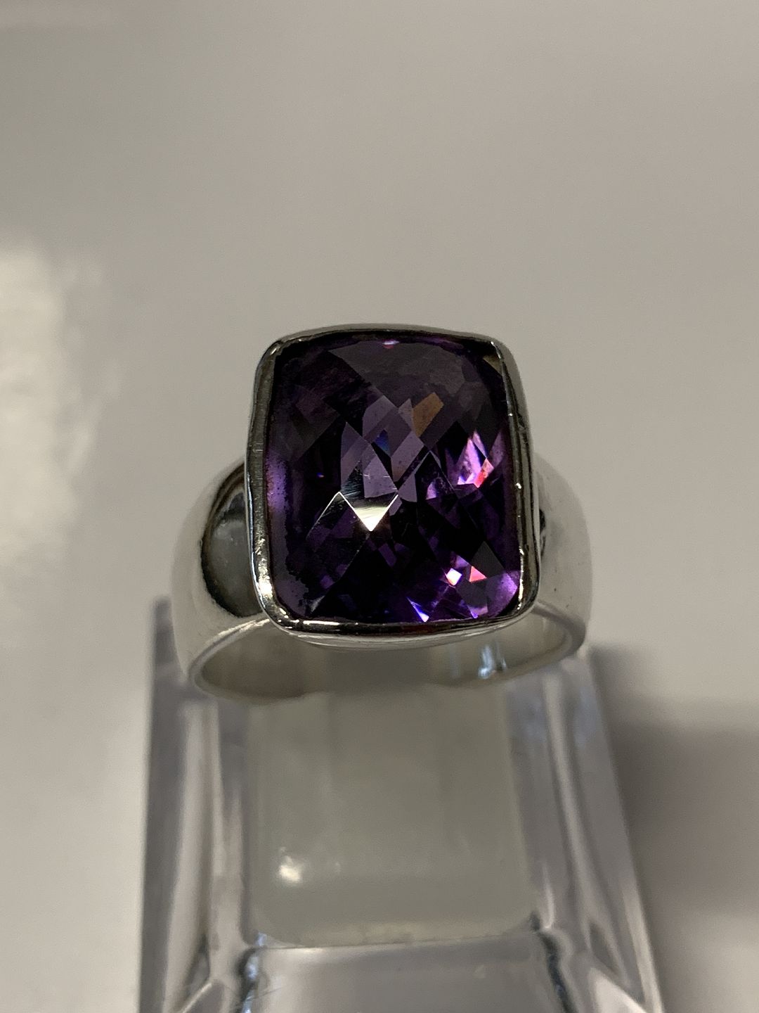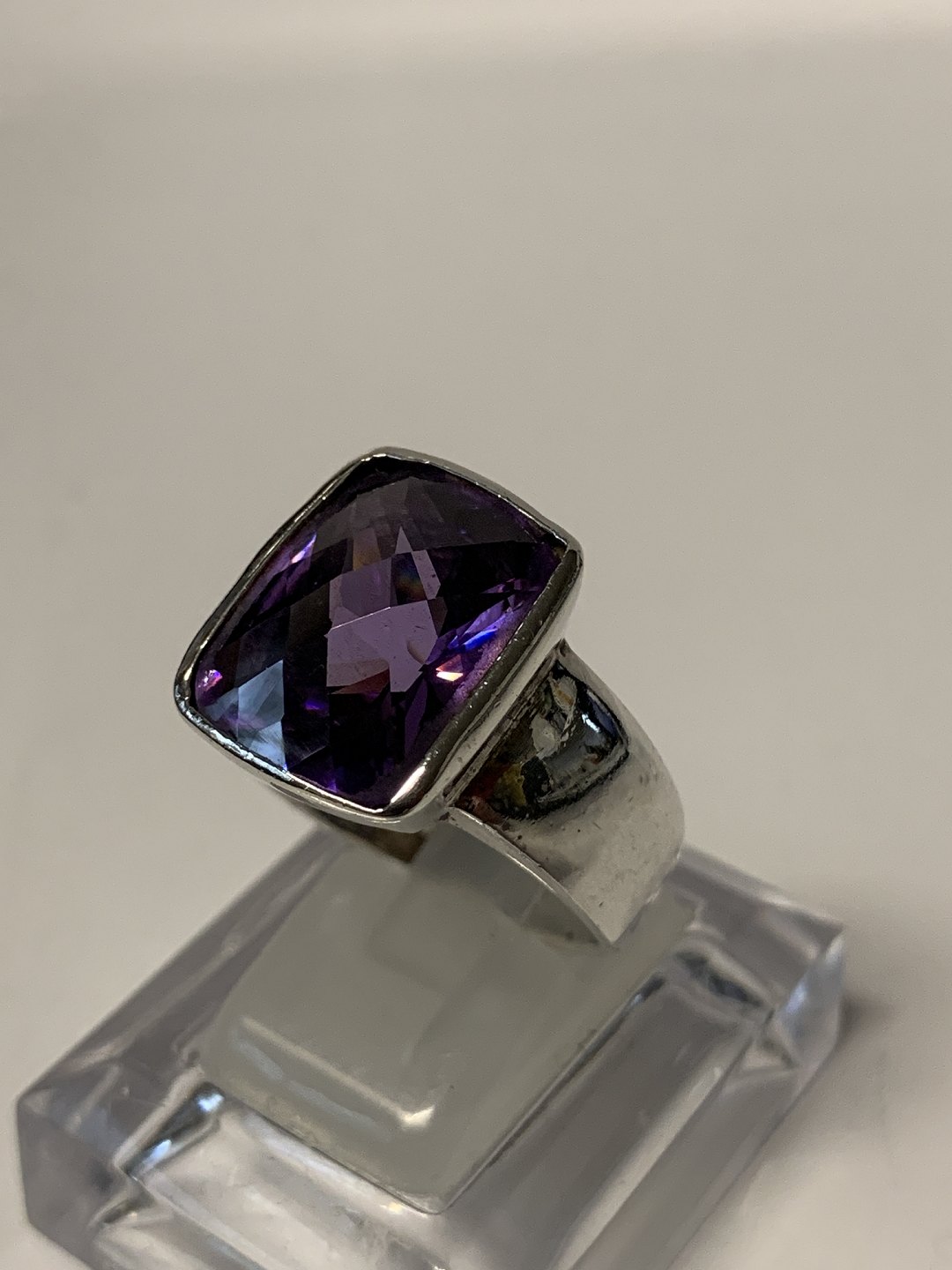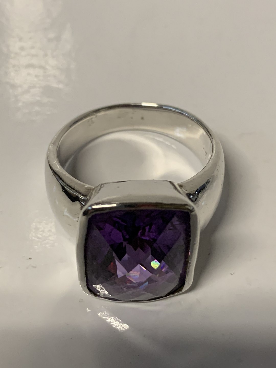 Cocktail Ring i sterlingsølv med lilla sten. Størrelse. 64. Stemplet 925S. Pæn og velholdt. Se desuden vores store udvalg af Sølvringe her: https://www.antikhuset.net/katindex.asp?kukat=5780