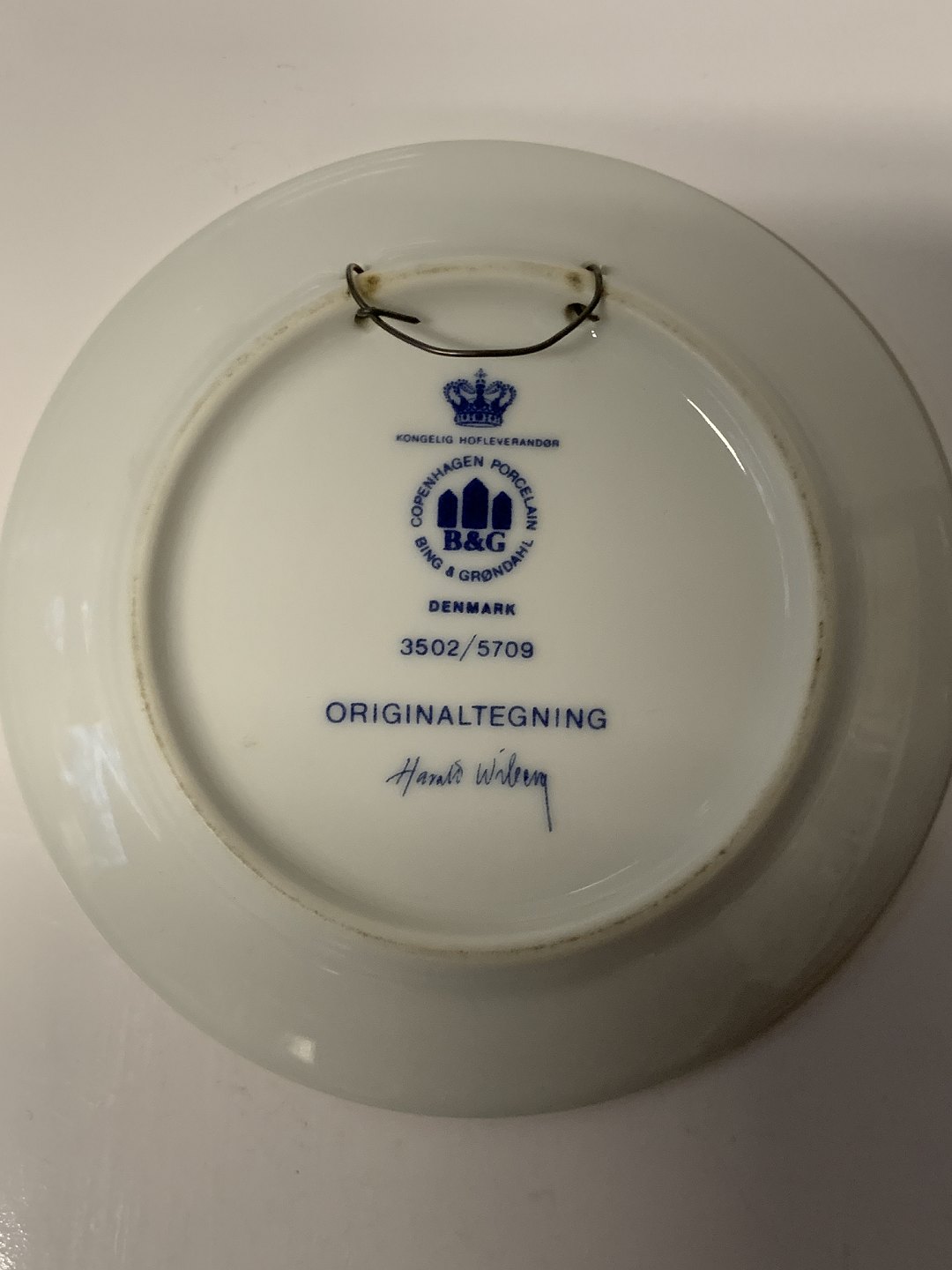 Bing & Grøndahl, Nisse fodre hund lille platte af Harald Wiberg. Dekorationsnummer 3502/5709. Denne er produceret mellem 1970 og 1983. 1. sortering. Diameter 10,4 cm. Pæn og velholdt stand