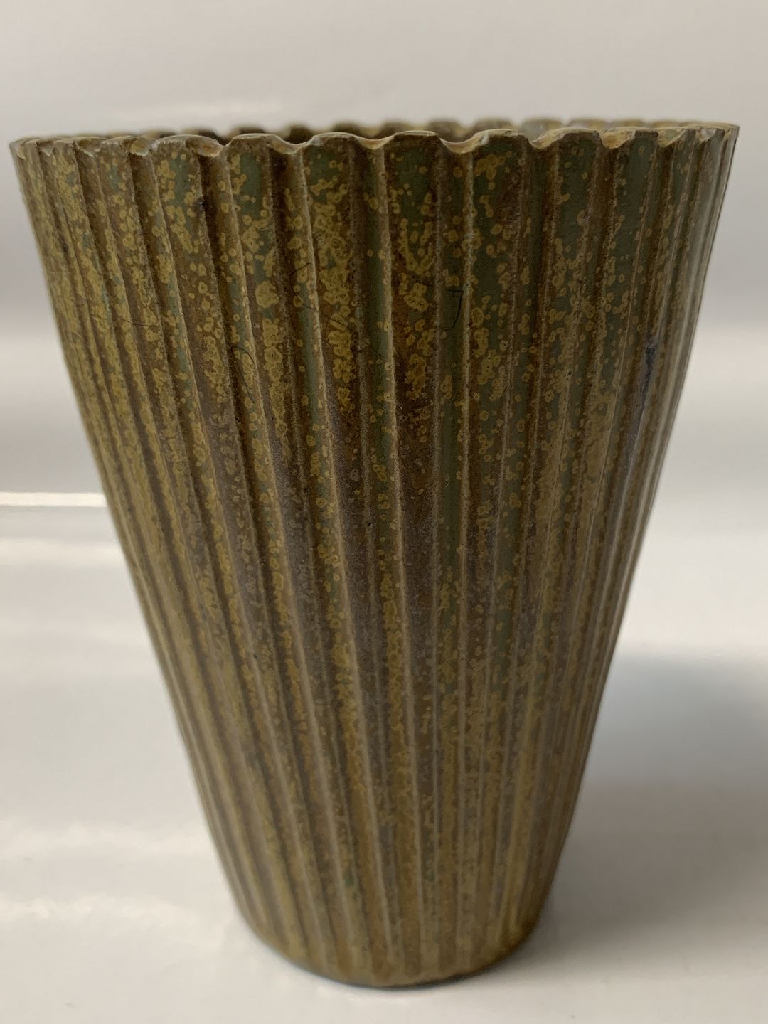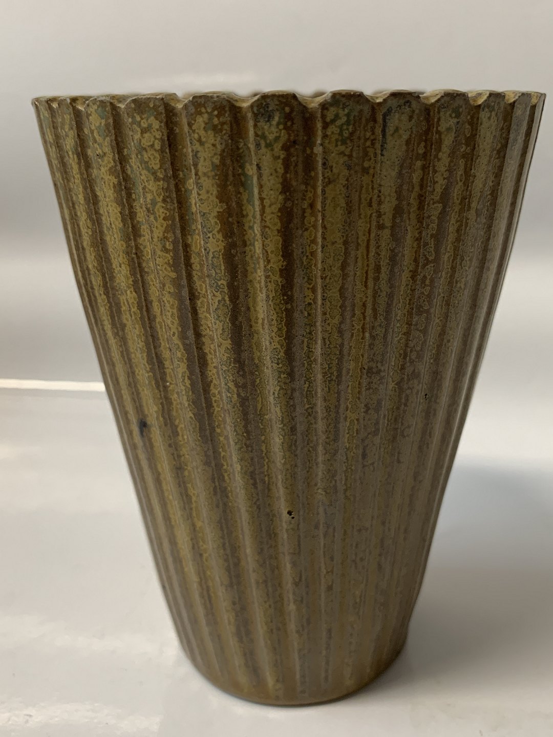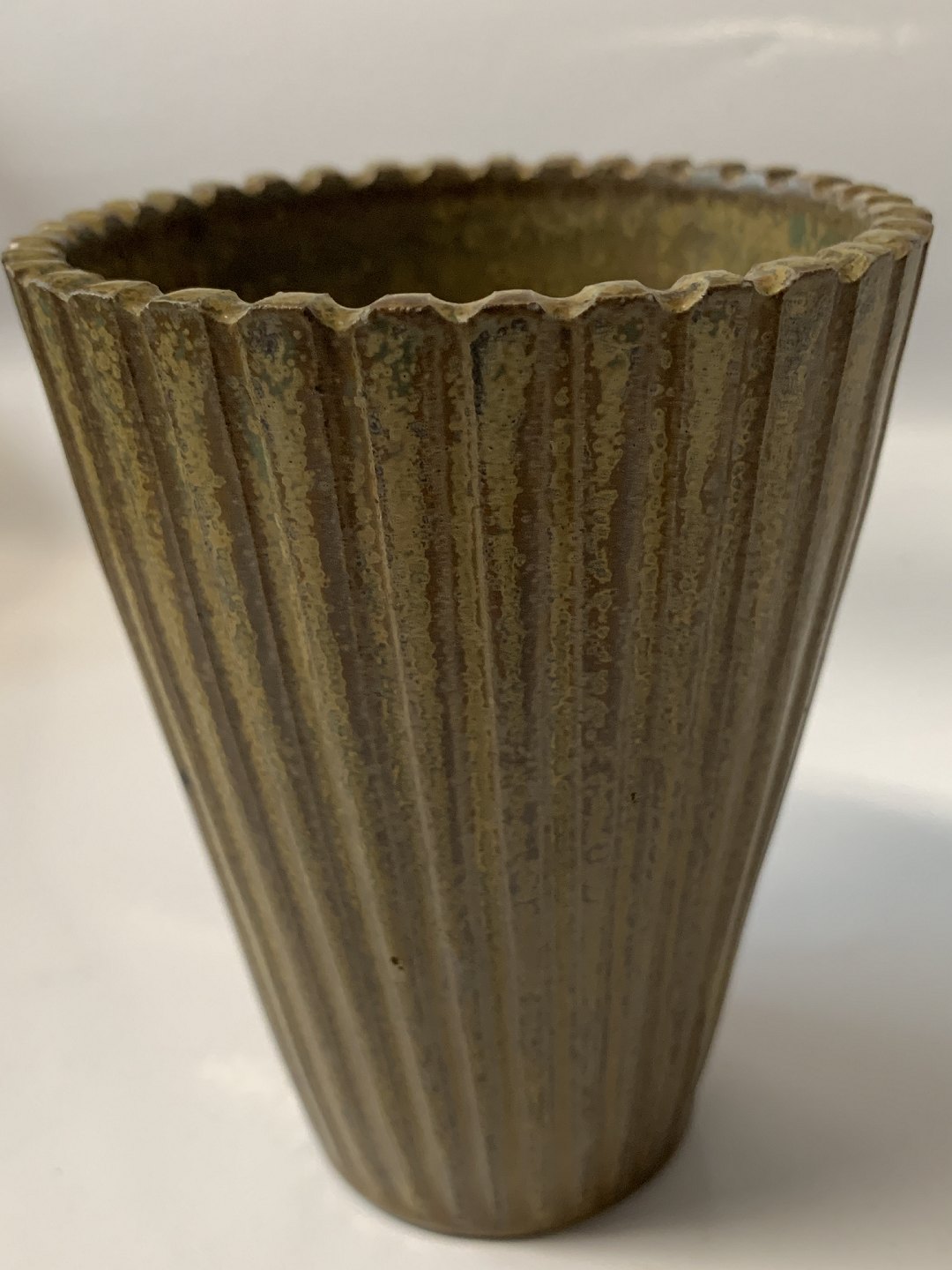 Arne Bang keramik, vase med riller og en flot glasur. Designnummer 116. Højde 12,5 cm. Diameter 9,4 cm. Perfekt stand.