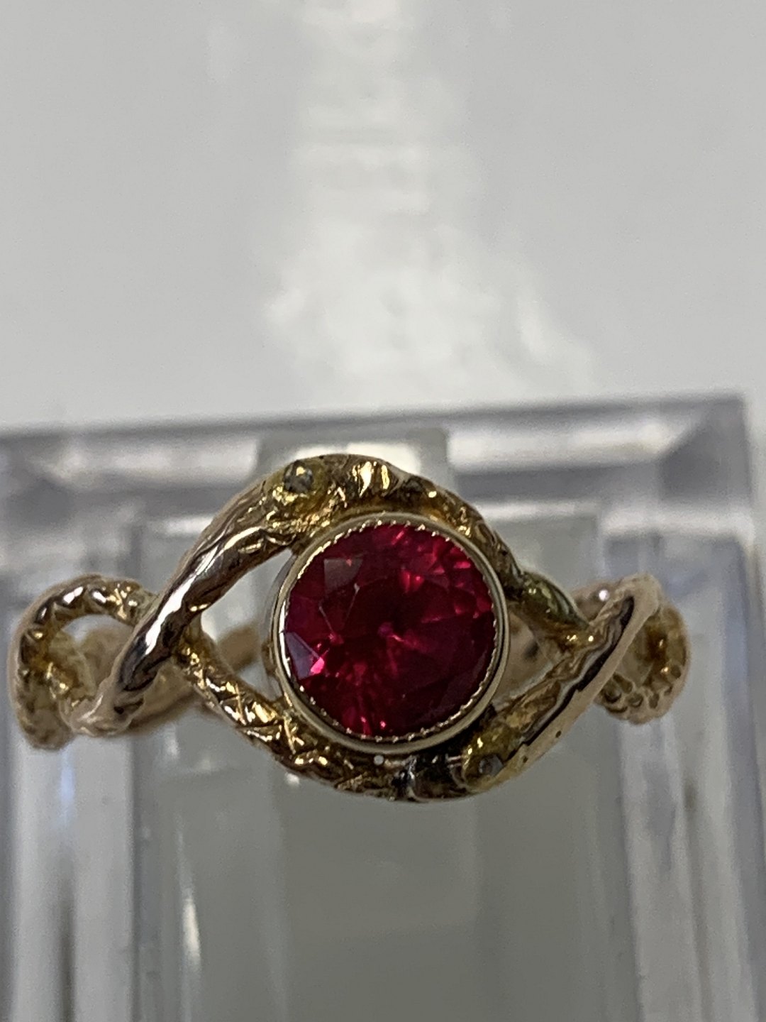 Smuk og elegant guldring med flot stor rød sten, og to mindre diamanter. Den røde sten giver ringen liv og styrke, men de to mindre diamanter reflekterer lyset, og giver ringen liv.
