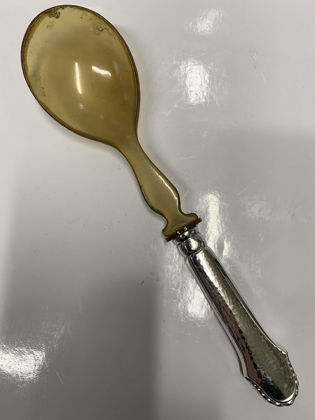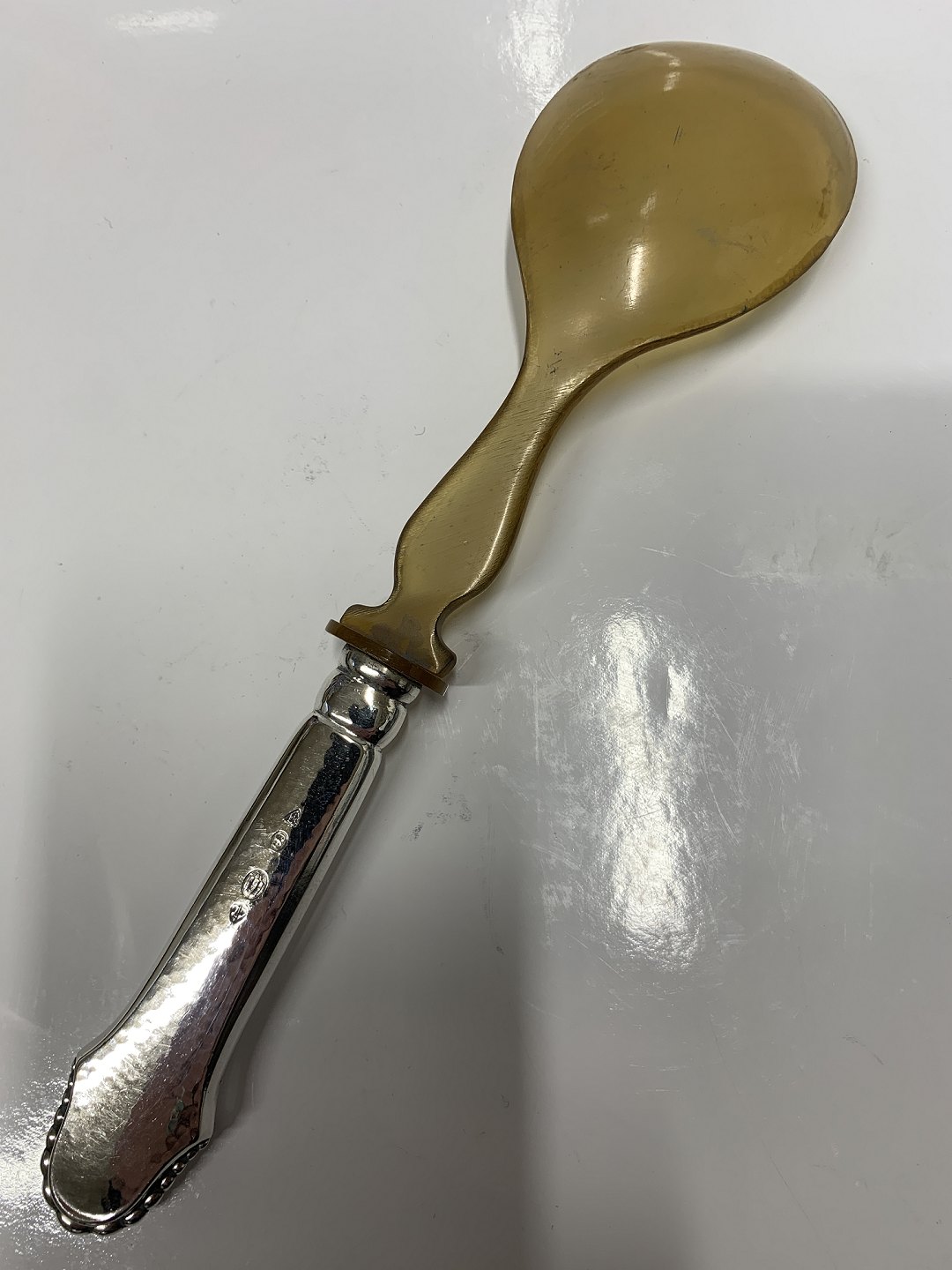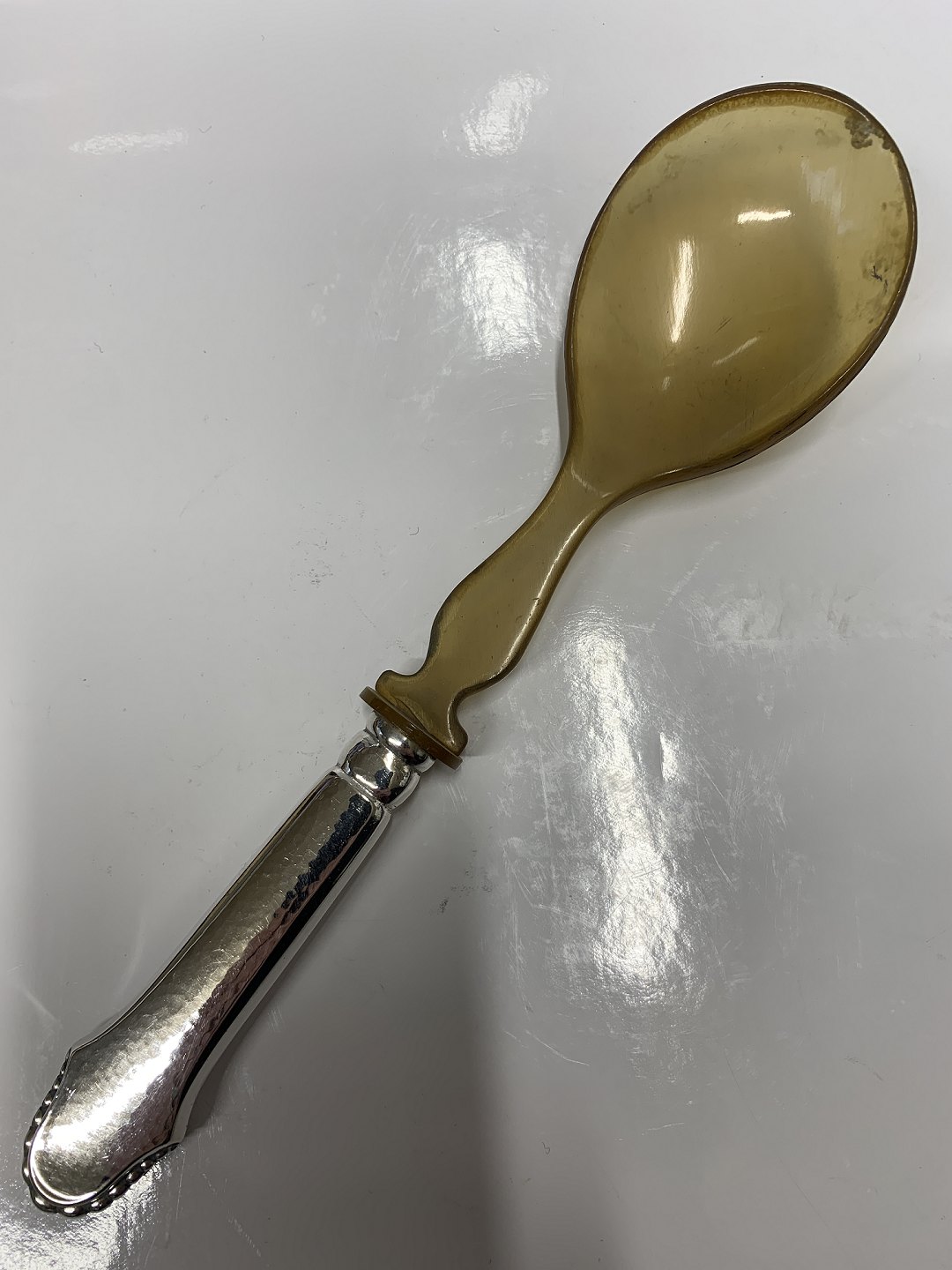 Christiansborg Sølv Surt ske med ben blad stor Toxværd Længde 21,6 cm. Har en lille hak på bladet se foto ellers Velholdt stand Pudset og pakket i pose