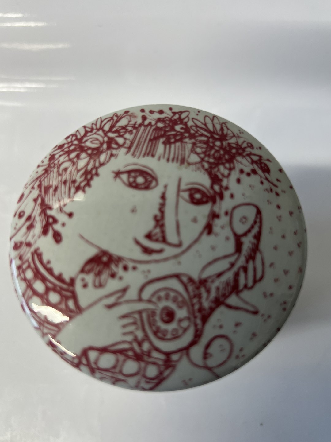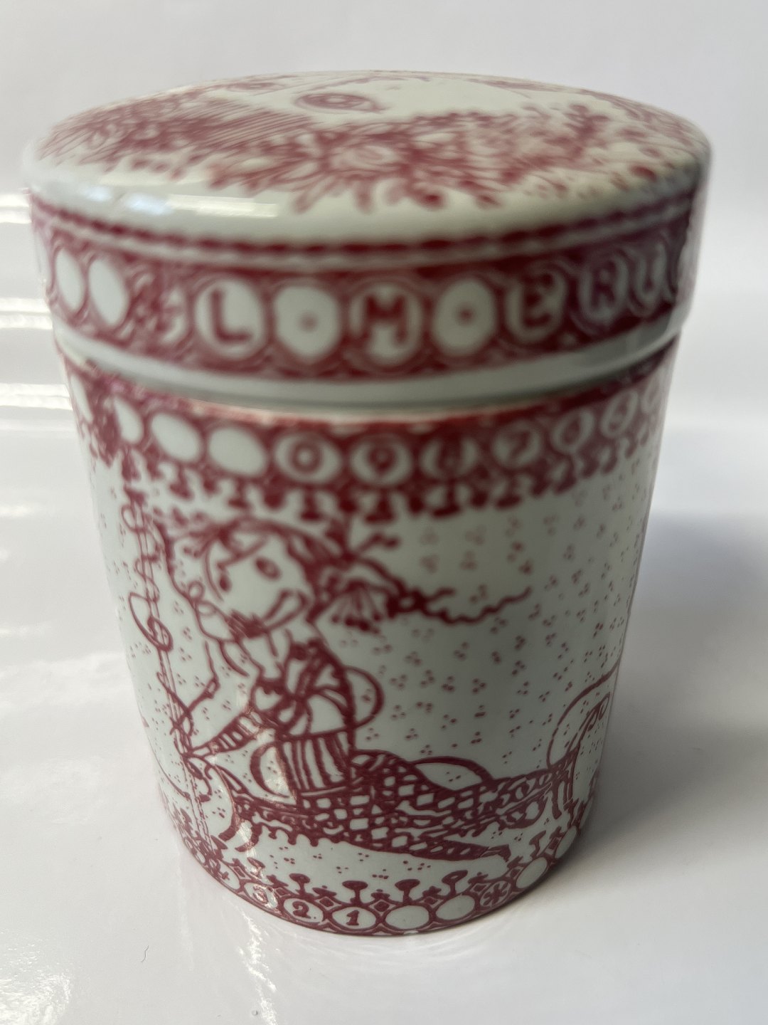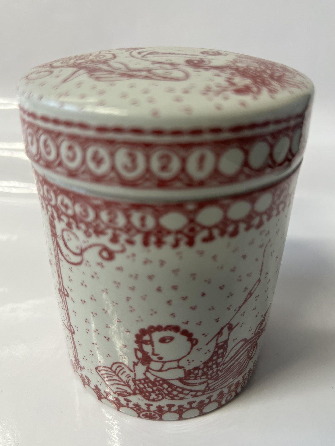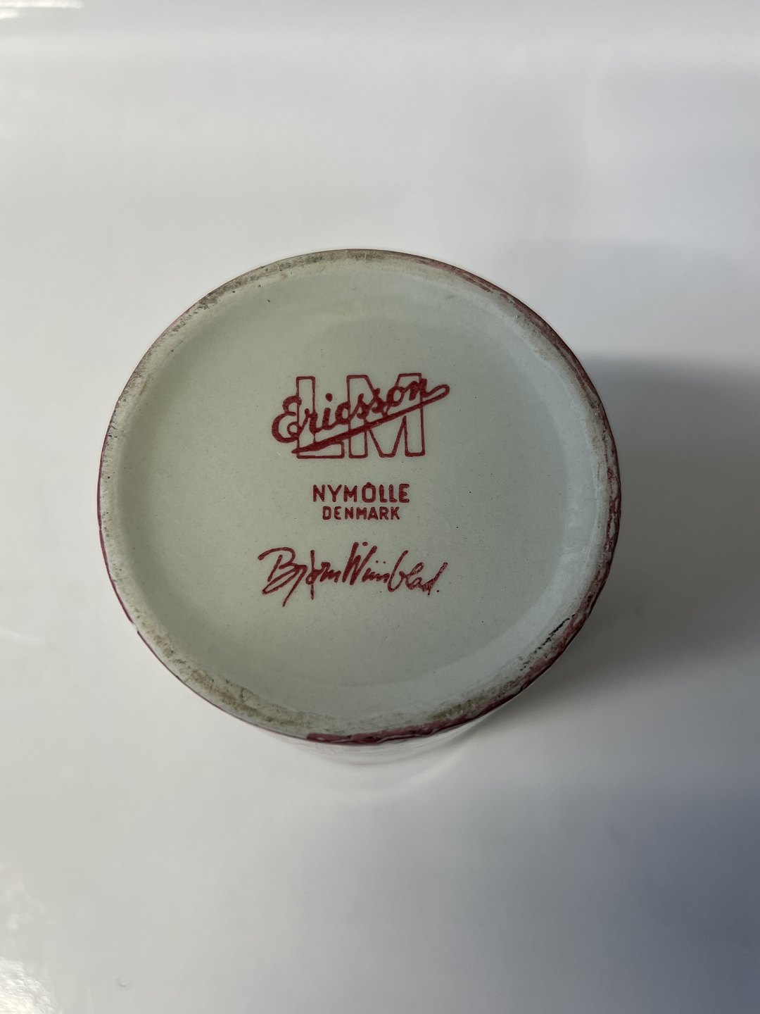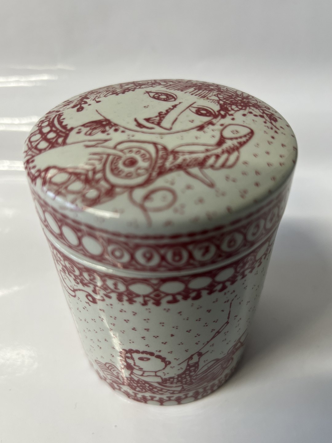 Bjørn Wiinblad keramik udført hos Nymølle. Rød te dåse / skål med låg fra LM Ericsson. Højde 10 cm. Ø: 7,5 cm. Pæn og velholdt stand