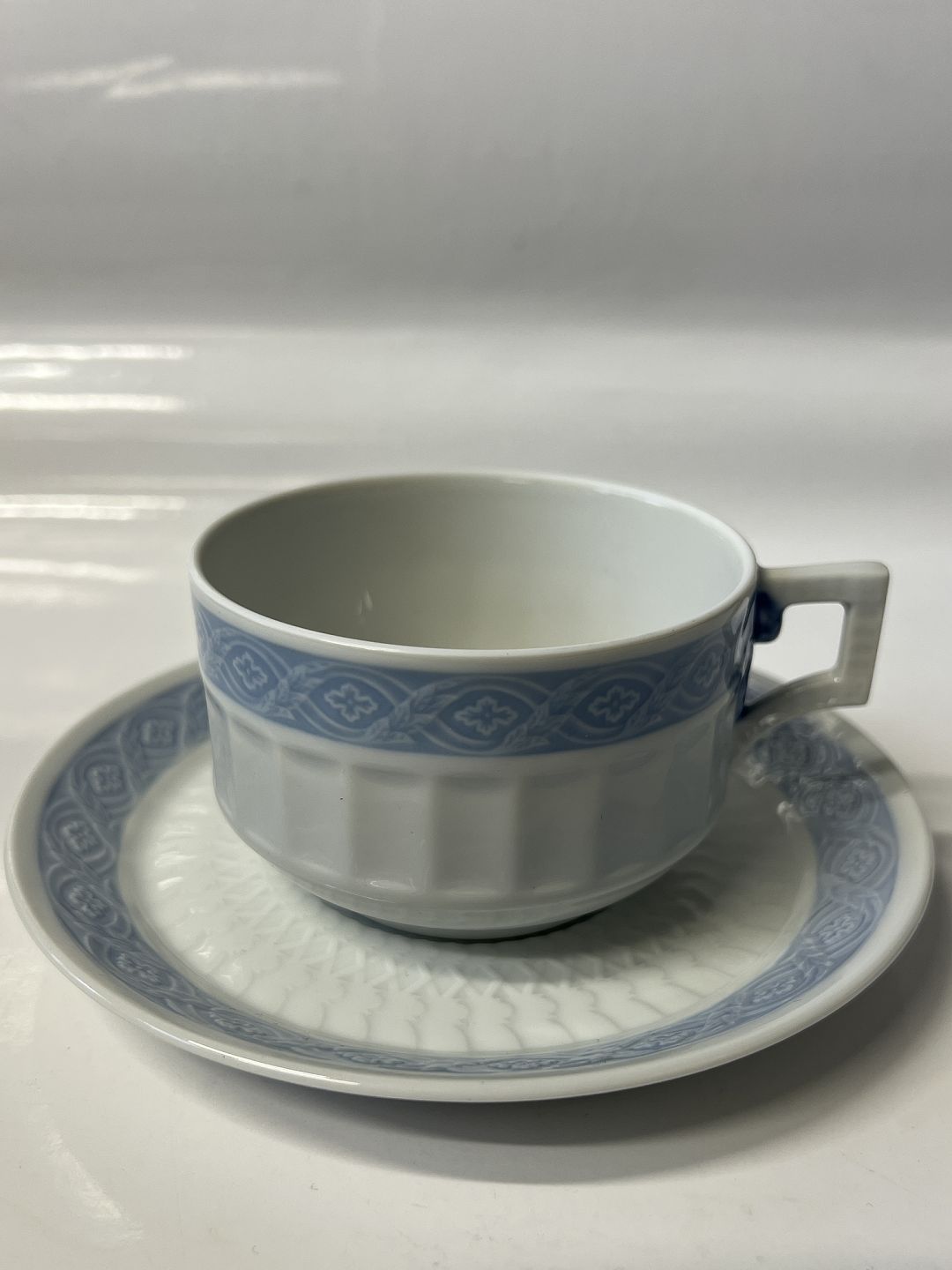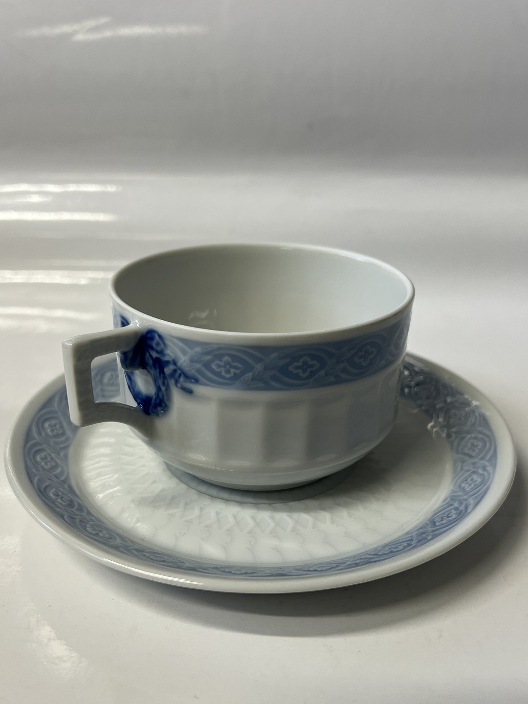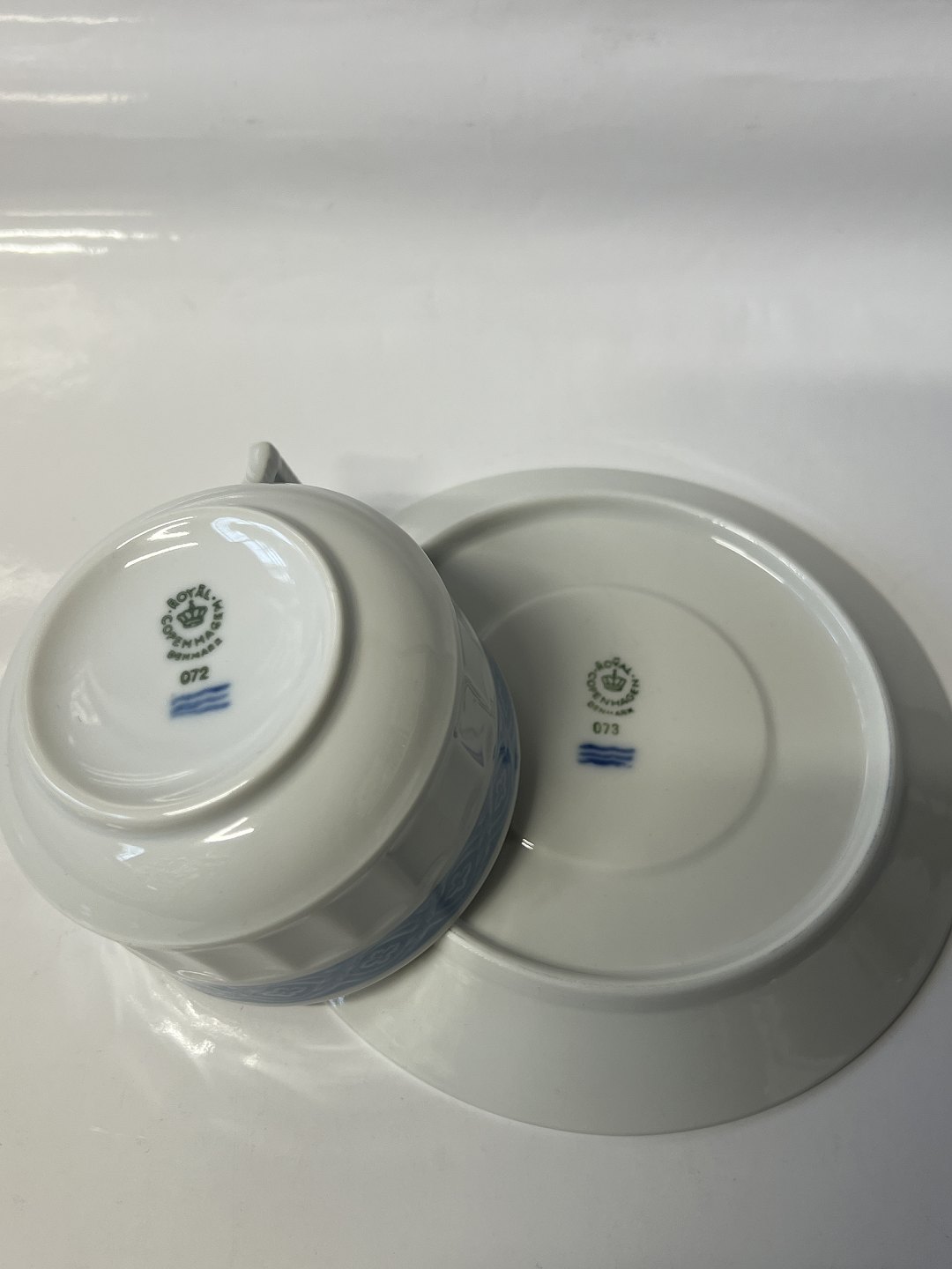 Royal Copenhagen Blå Vifte, ekstra stor morgenkop / chokoladekop med tilhørende underkop. Dekorationsnummer 072 / 073 det samme som 1212/11554. 1. sortering. Koppens diameter er 9,9 cm. Perfekt stand uden fejl.