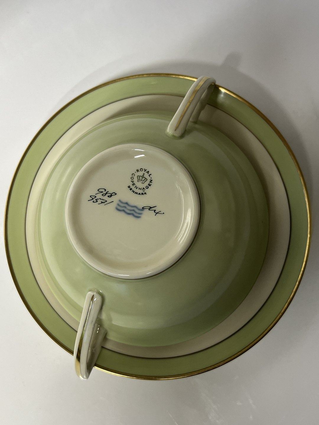 Royal Copenhagen Dagmar bouillonkop med tilhørende underkop. Dekorationsnummer 988/9571. 1. sortering. Diameter på koppen er 12,9 cm. Perfekt stand uden fejl.