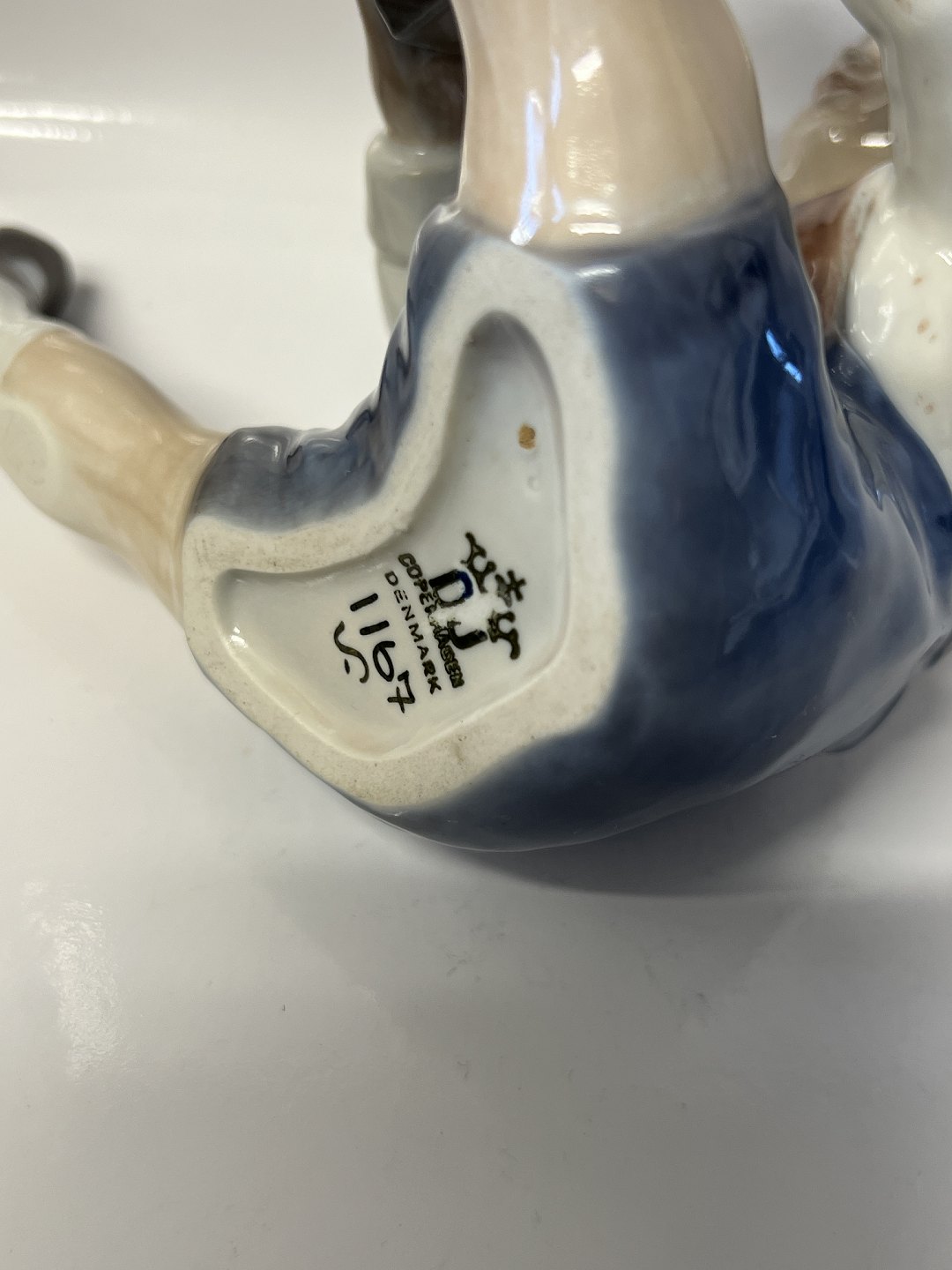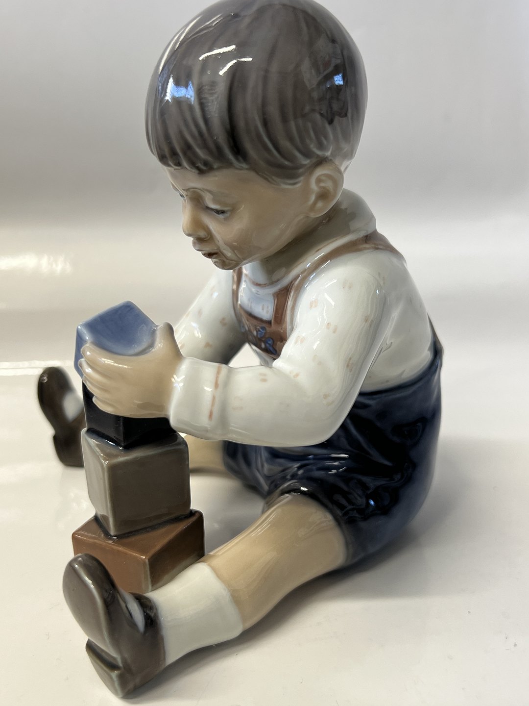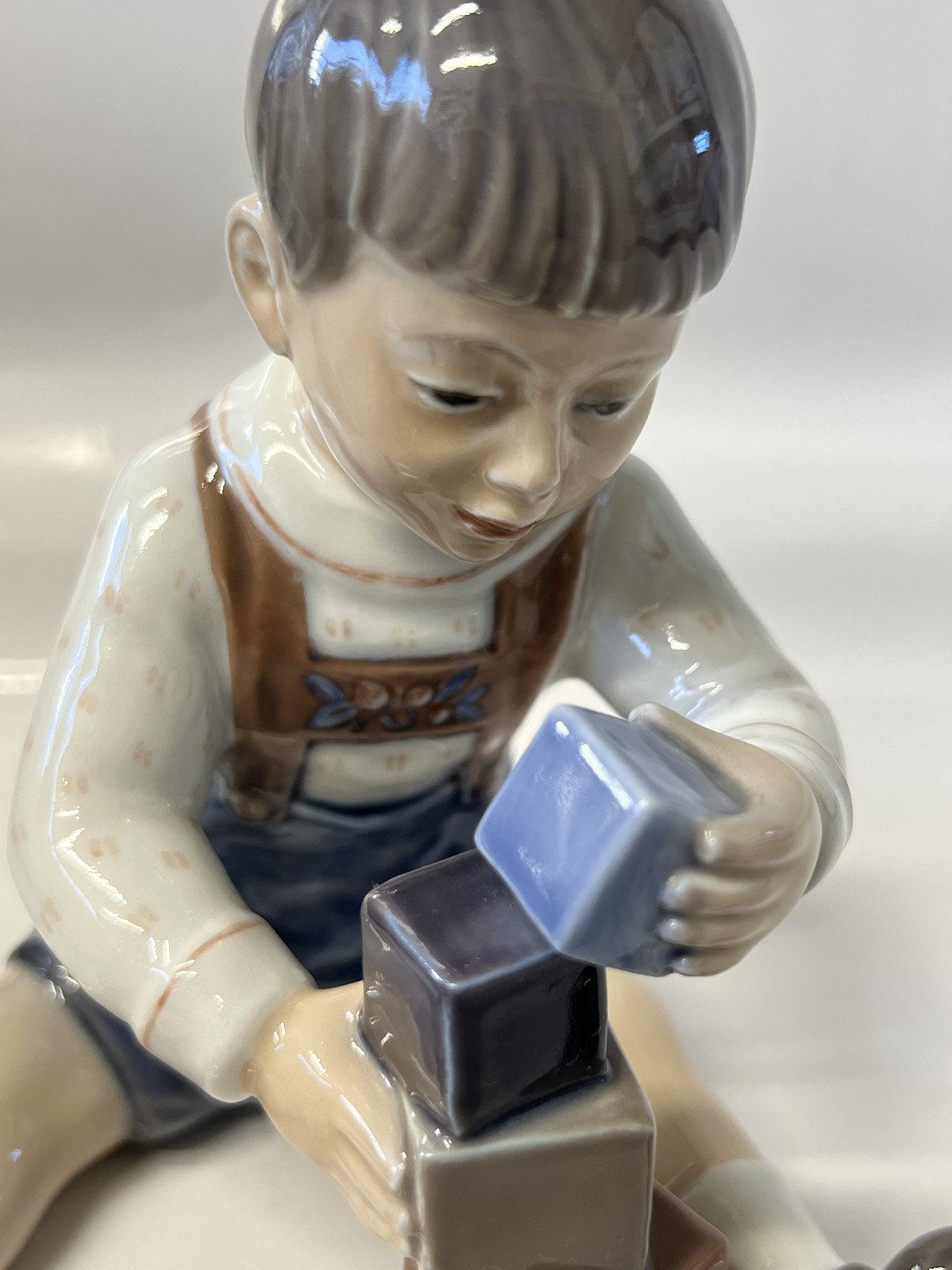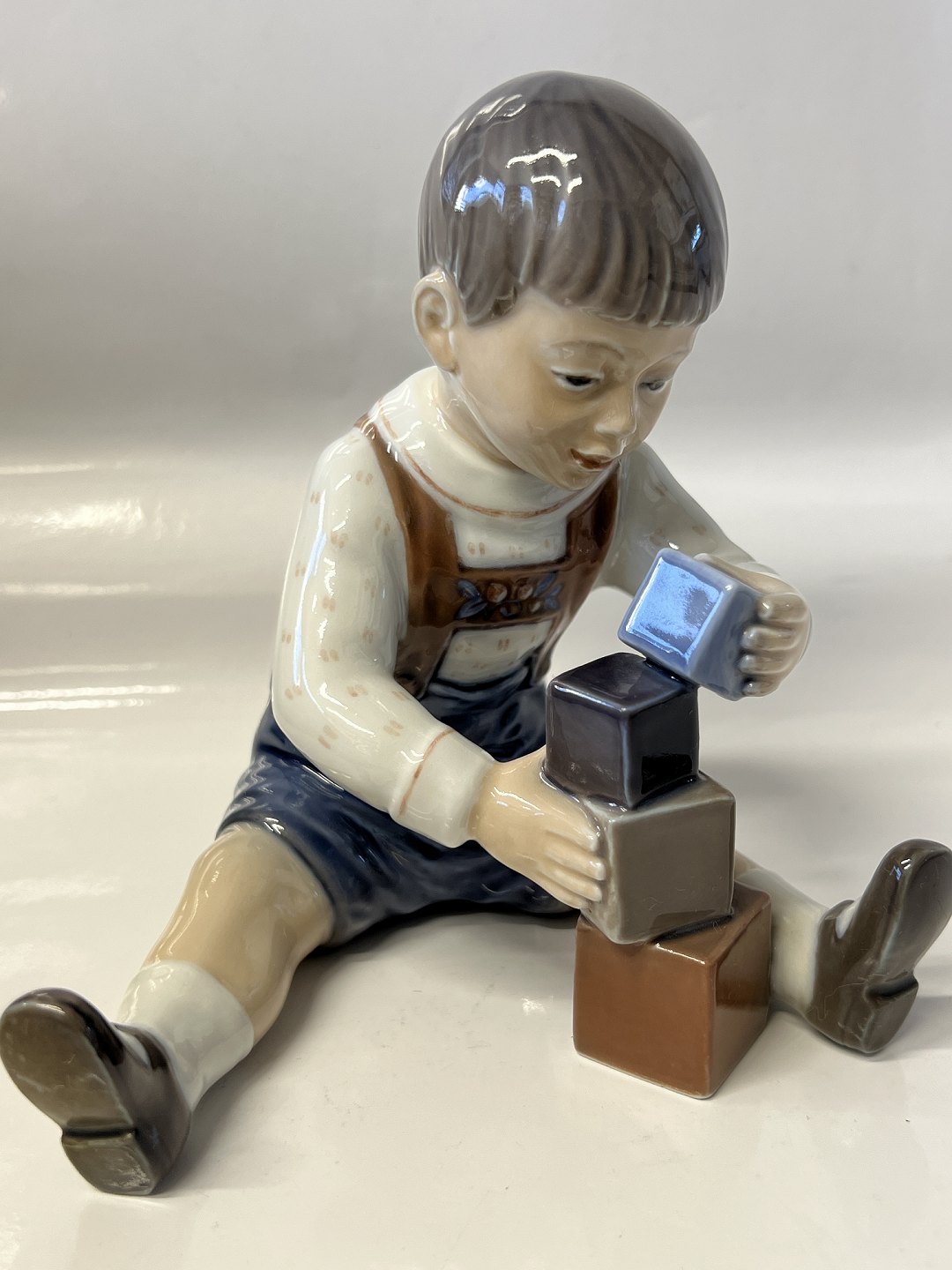 Dahl Jensen figur, dreng med klodser. Af fabriksmærket ses det, at denne er produceret mellem 1928 og 1985. Dekorationsnummer 1167. 3. sortering. Højde 13,5 cm., længde 11,5 cm. Perfekt stand uden fejl.
