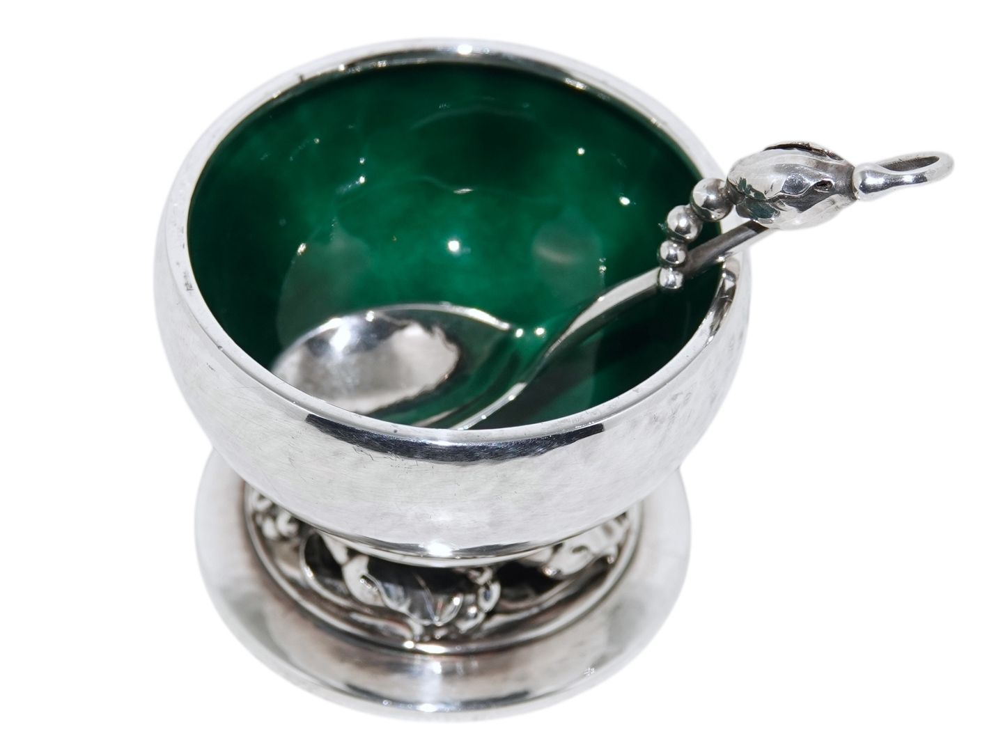 Georg Jensen Blossom (Magnolia) sterling silver, salt jar with green enamel and salt spoon.