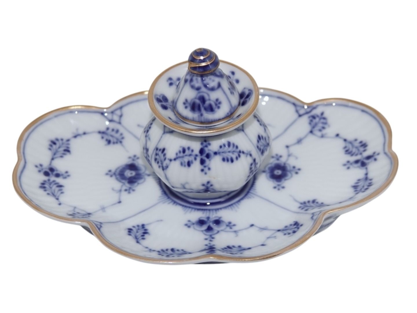 Royal Copenhagen Blue Fluted with gold edge, rare inkwell. The factory mark tells, that this was produced between 1898 and 1923. Decoration number 1/129. Factory first. Length 15.0 cm. Perfect condition.