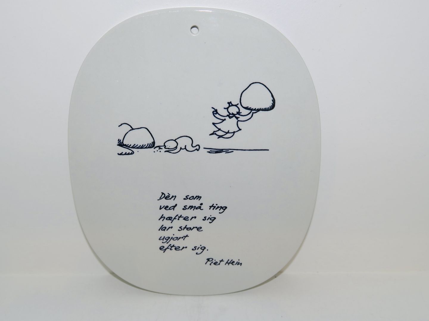 Royal Copenhagen Piet Hein platte med gruk. Den som ved små ting hæfter sig har store ugjort efter sig. Dekorationsnummer 10-3713. 1. sortering. Måler 16,7 x 14,0 cm. Perfekt stand uden fejl.