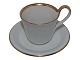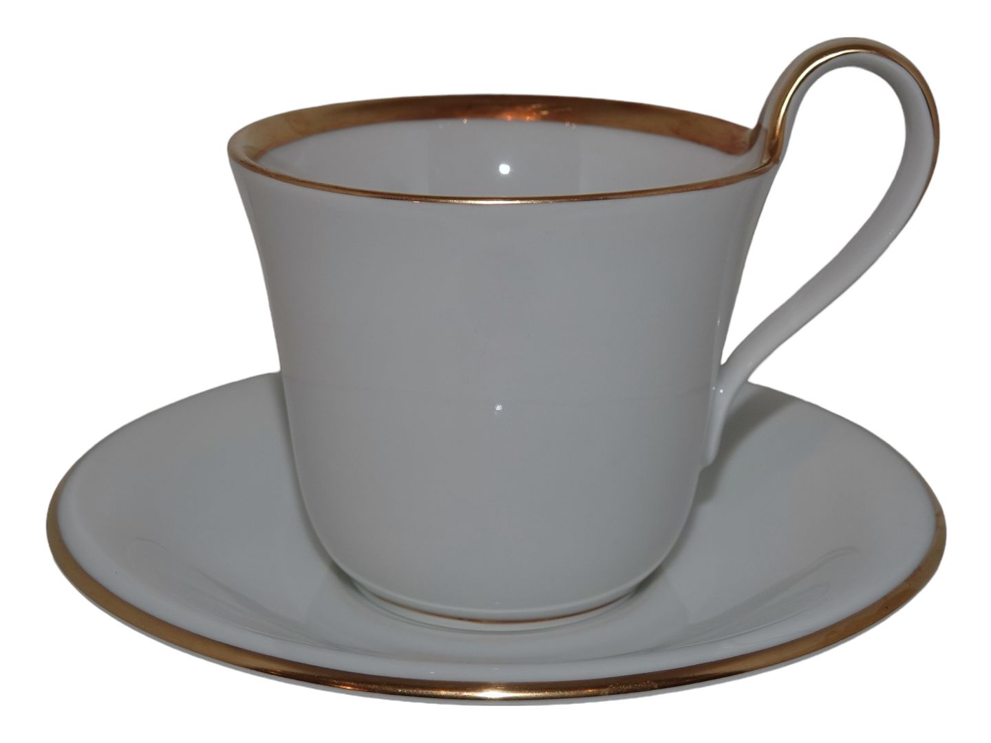 Bing & Grøndahl Jet'aime, hvid højhankskop med guldkant og underkop. De findes i tre størrelser. Disse er mellemstørrelse.
