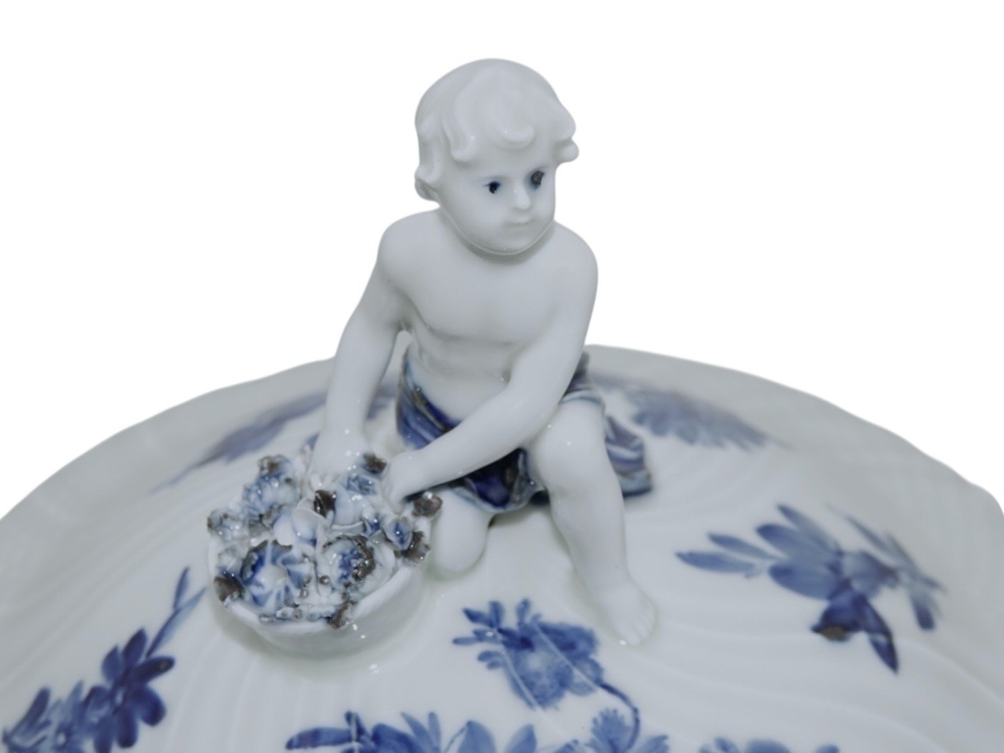 Royal Copenhagen Blue Flower Curved, round soup tureen with boy holding a flower basket.