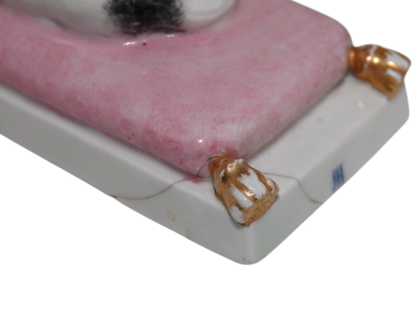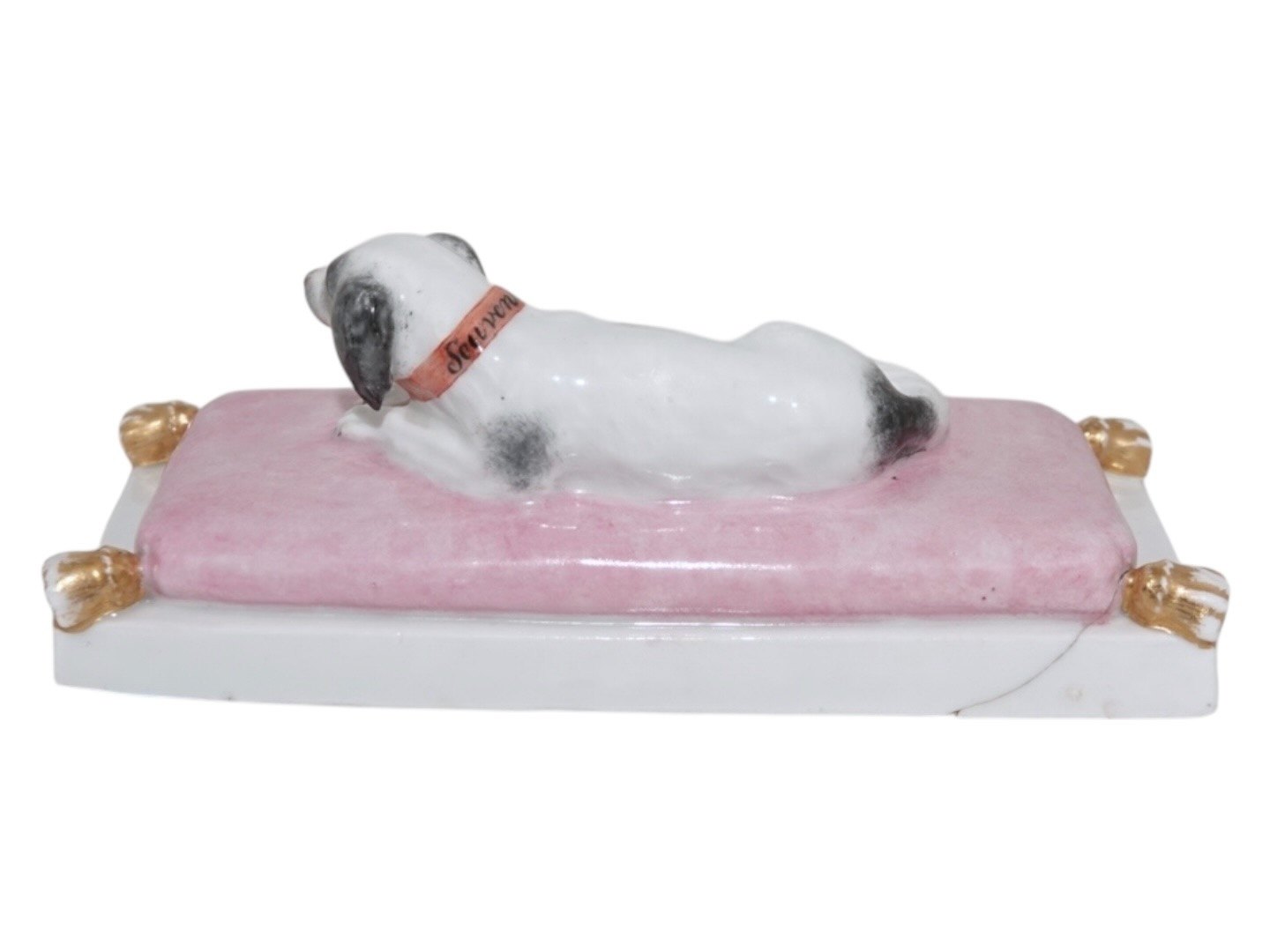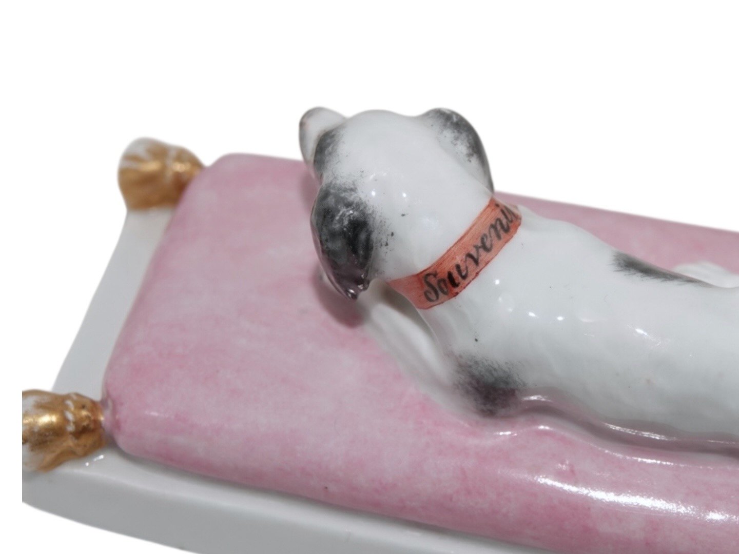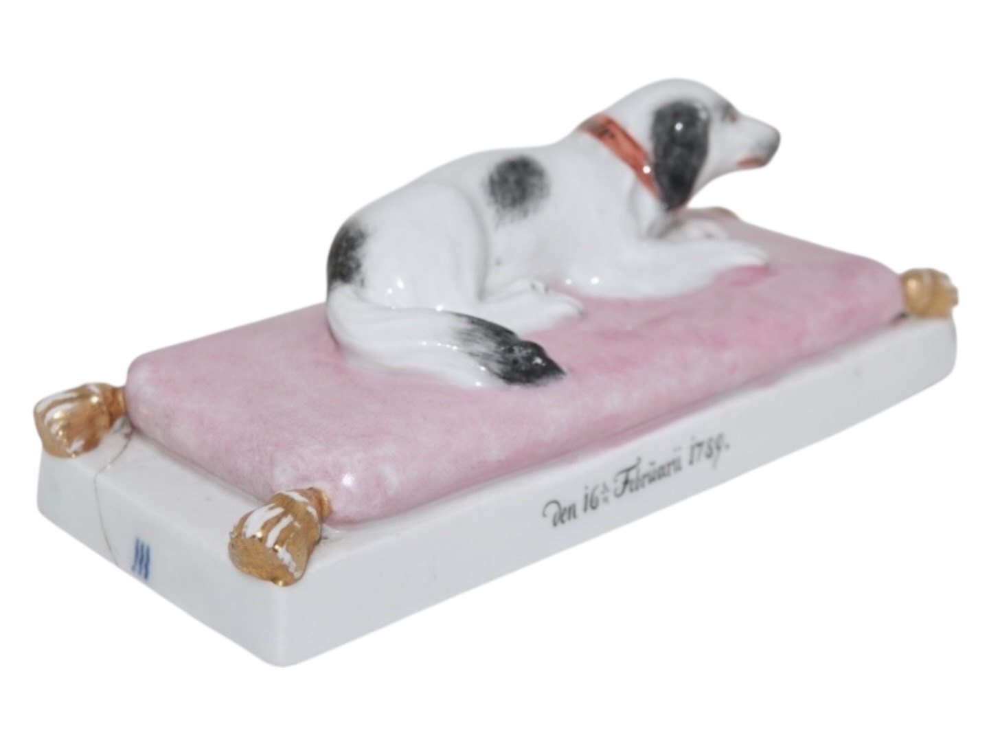 Royal Copenhagen porcelain, letterpress with dog laying on a pink pillow and with the text "Den 16. Februarii 1789". On the dogs collar it says "Souvenir".