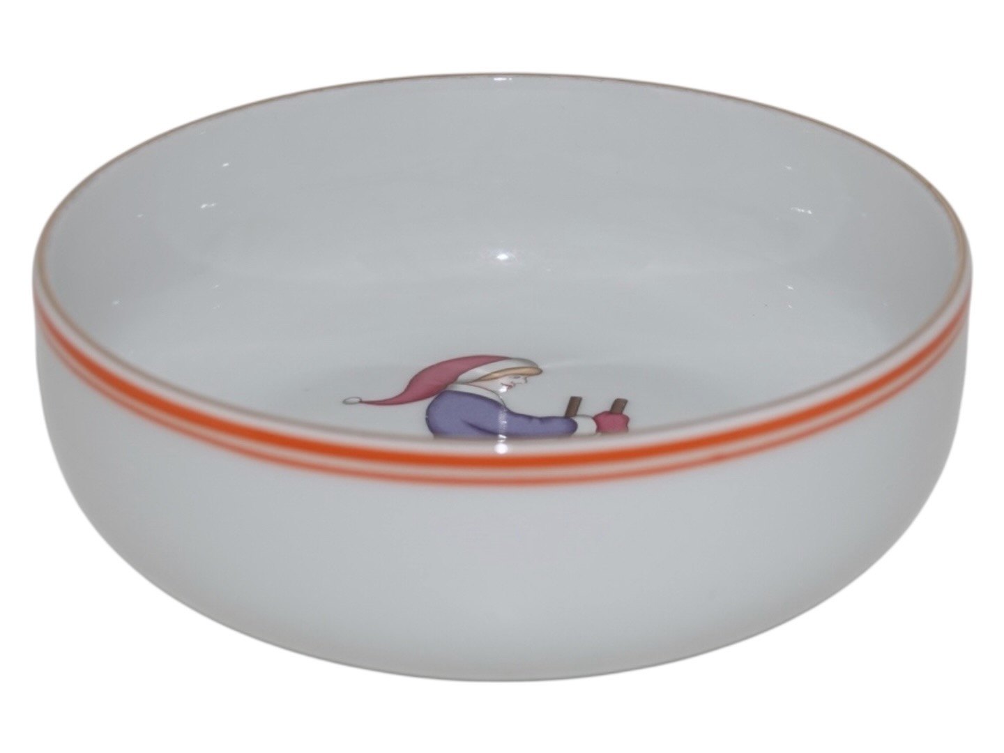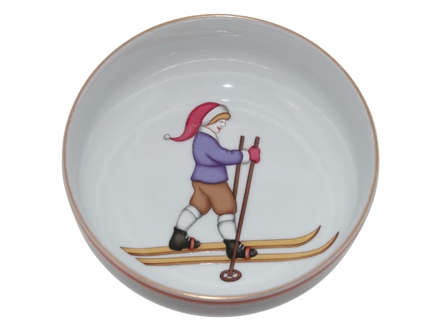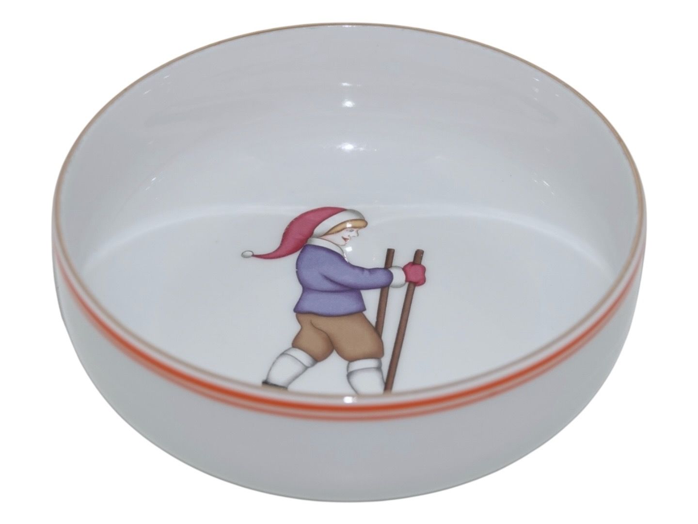 Bing & Grøndahl, grødskål / ymerskål dekoreret med dreng med nissehue på ski Dekorationsnummer 323. Denne er produceret mellem 1970 og 1983. 1. sortering. Diameter 14,6 cm. Perfekt stand.