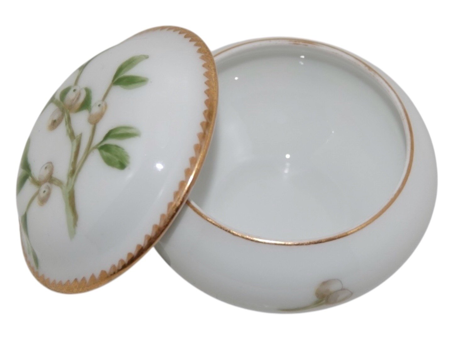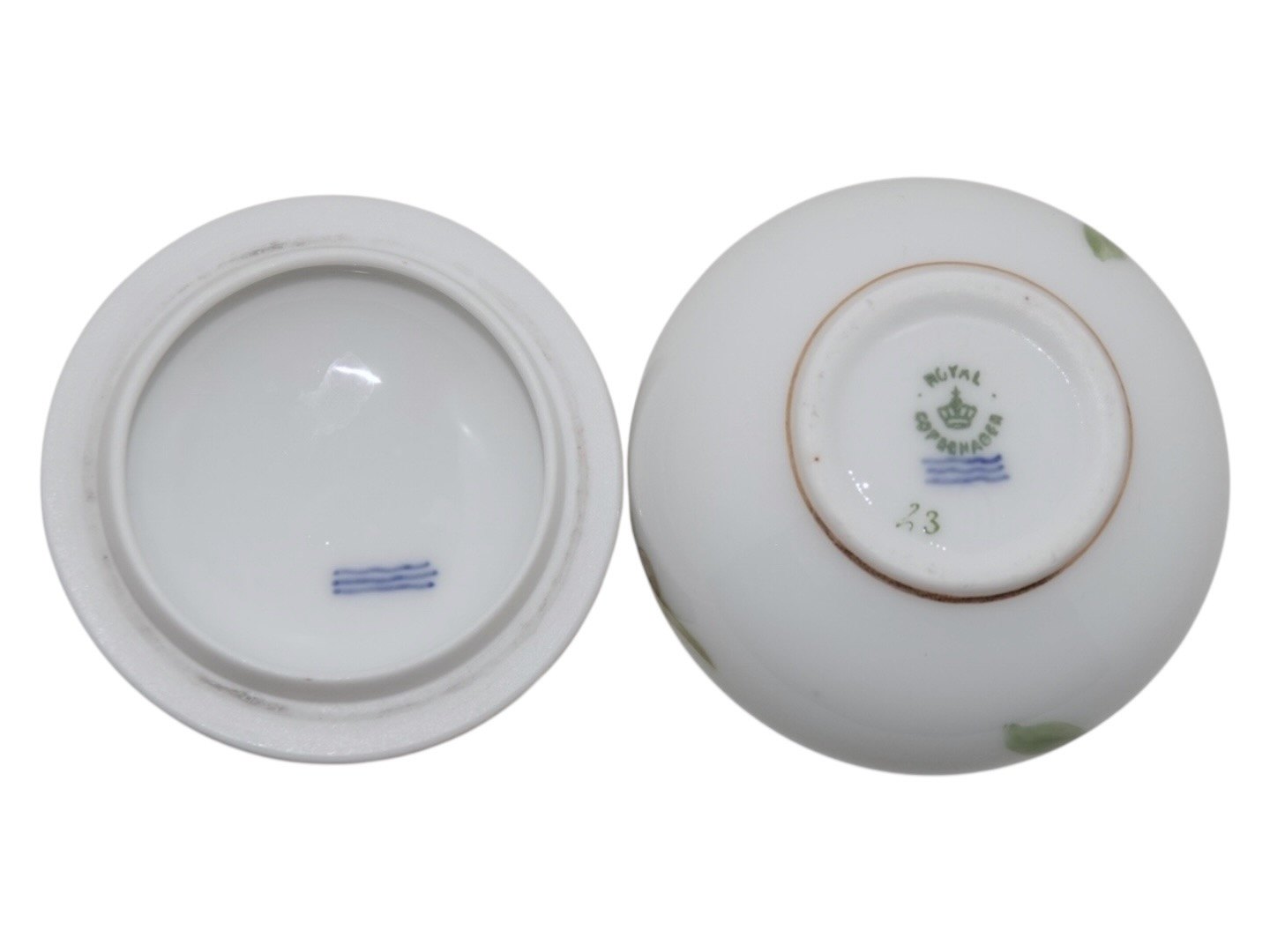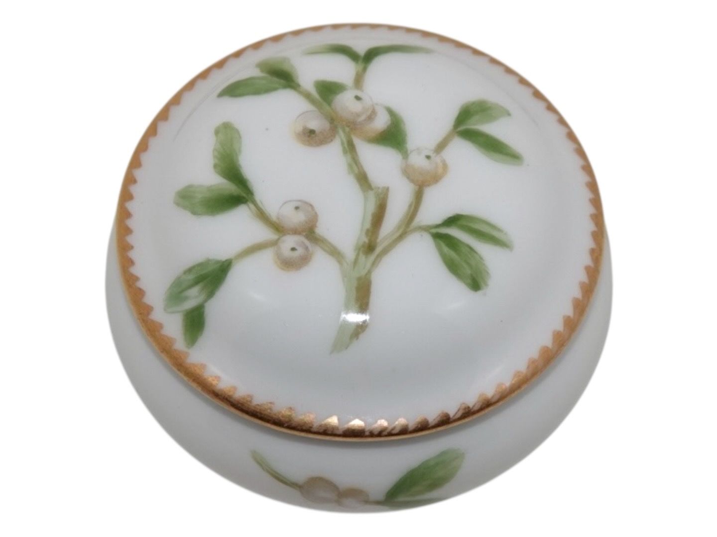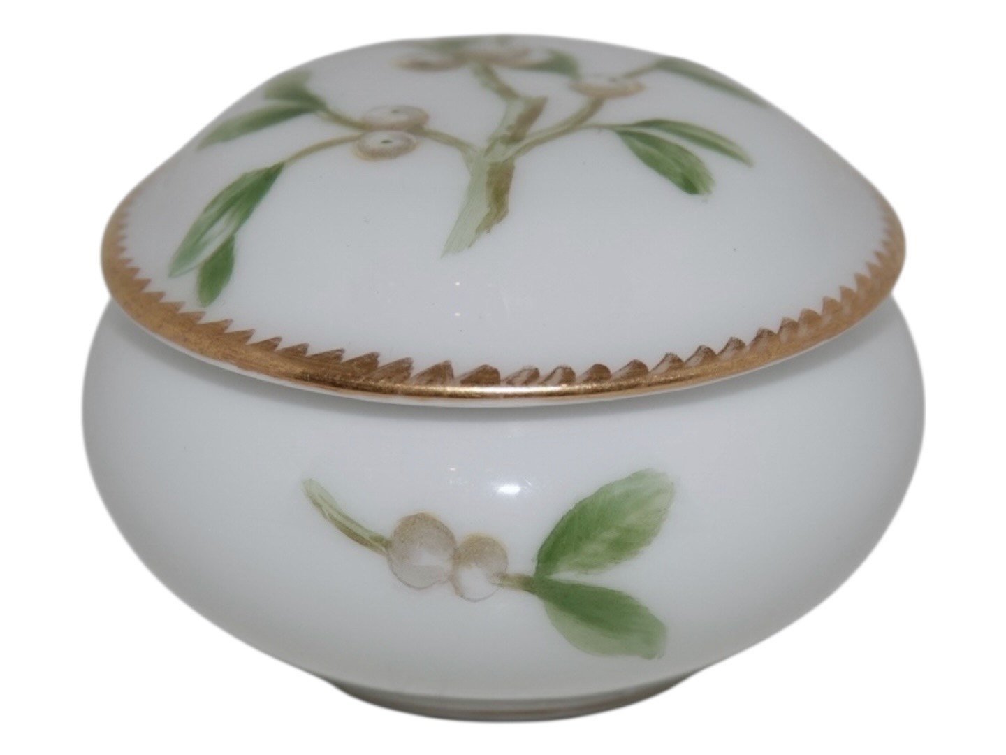 Royal Copenhagen Art Nouveau, lille rund æske med snebær. Af fabriksmærket ses det, at denne er produceret mellem 1898 og 1923. 1. sortering. Diameter 6,5 cm. Perfekt stand uden fejl.