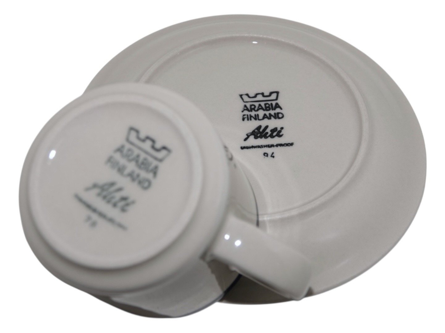 Arabia Finland Ahti, lille kaffekop med underkop. Designet af Anja Jaatinen-Winquist i 1980'erne. Diameter på koppen er 6,5 cm. og højden er 6,0 cm. Perfekt stand.