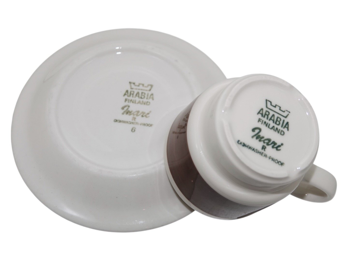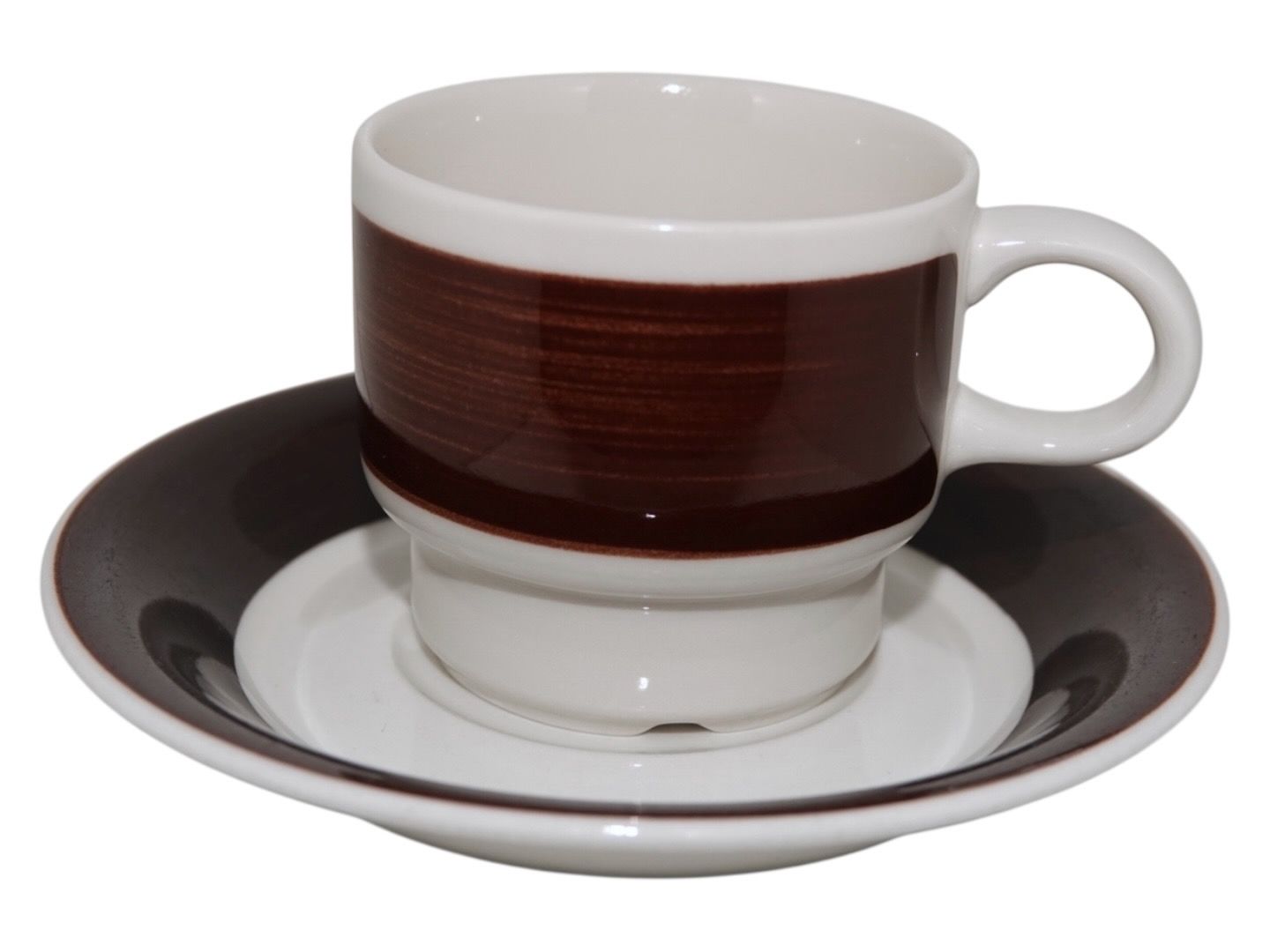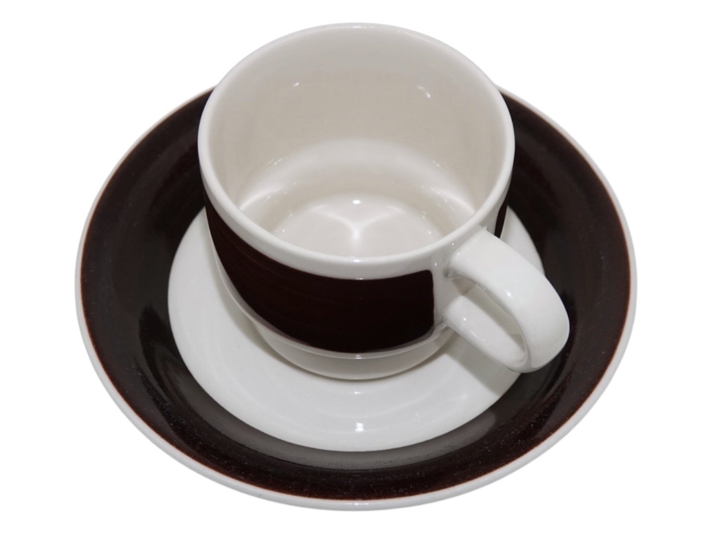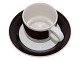 Arabia Finland Inari, lille mørkebrun kaffekop med underkop. Designet af Göran Bäck i 1976. Diameter på koppen er 6,7 cm. og højden er 6,1 cm. Perfekt stand.