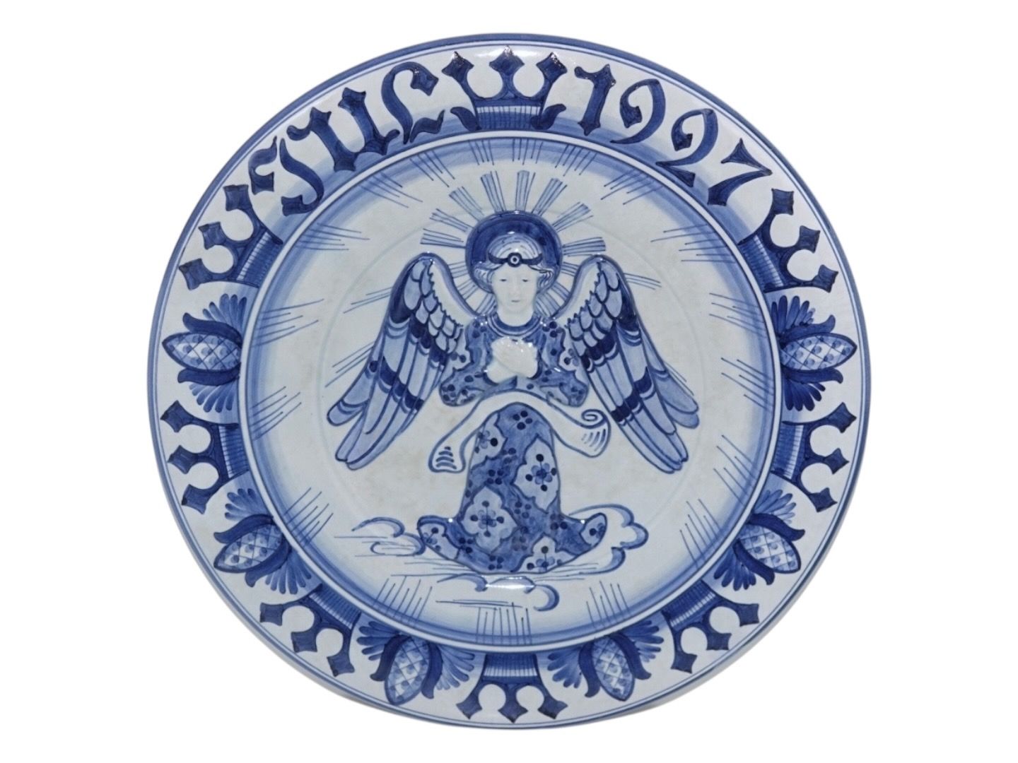 Aluminia Tranquebar, stor og sjælden set juleplatte fra 1927. Dekorationsnummer 4114/1353. 1. sortering. Diameter 30,5 cm. Der er krakkeleringer og små misfarvninger i glasuren ellers fejlfri stand uden fejl.