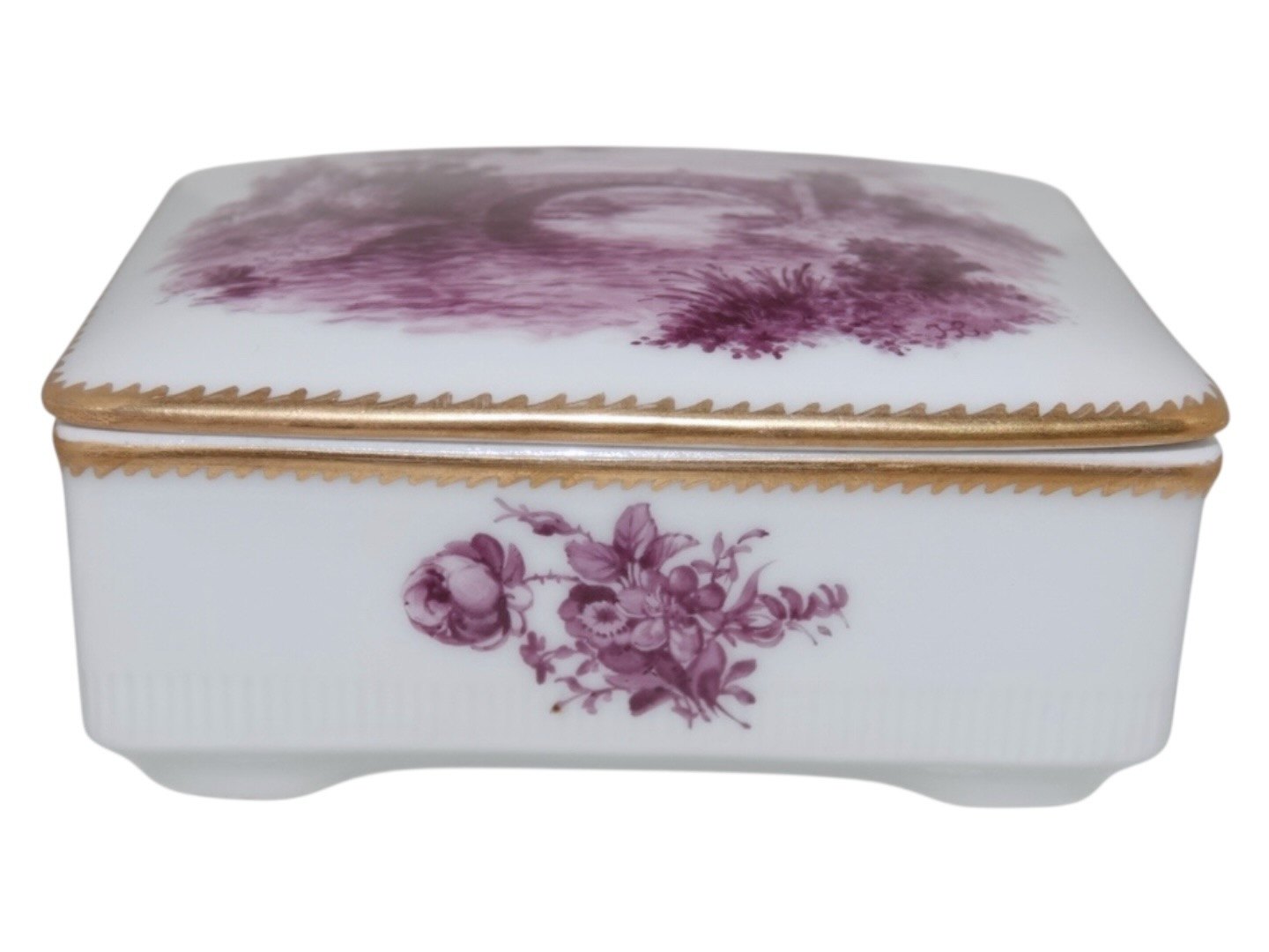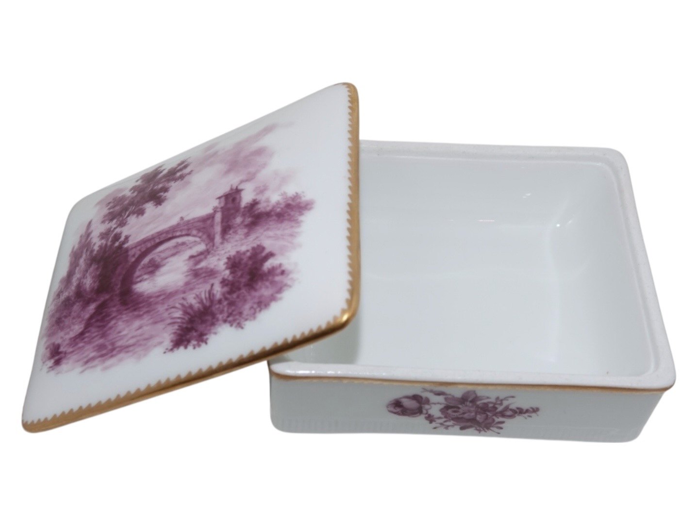 Pirkenhammer porcelæn fra Bøhmen / Tjekkoslovakiet, lågæske med purpur dekoration. Måler 11 x 9 cm. Perfekt stand.