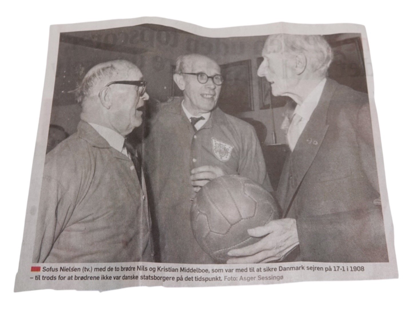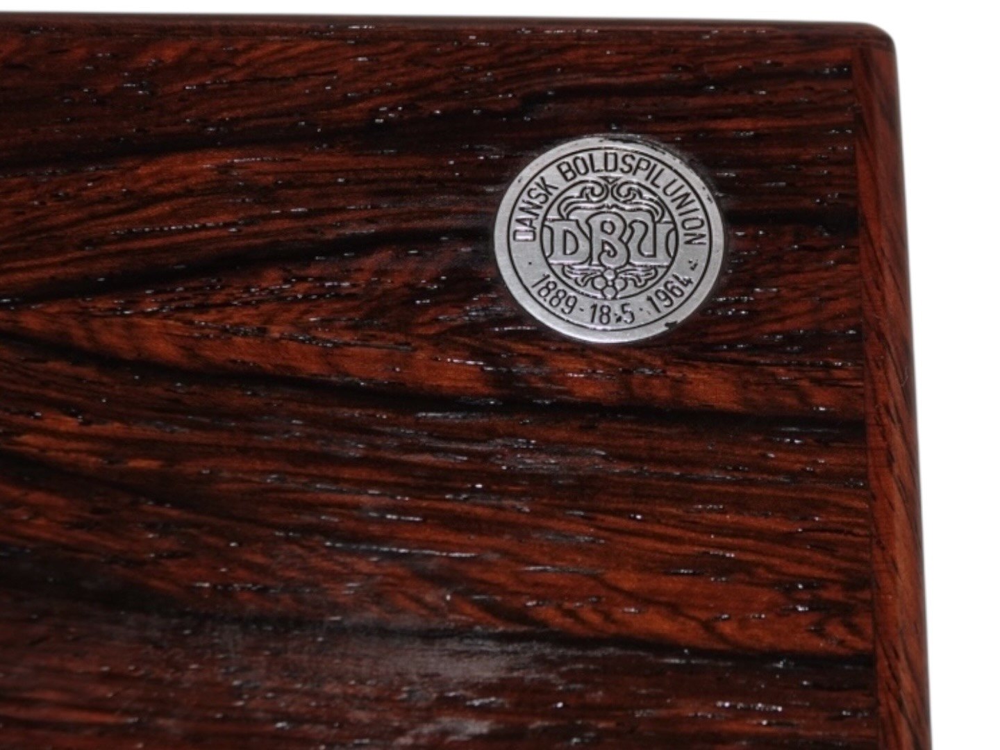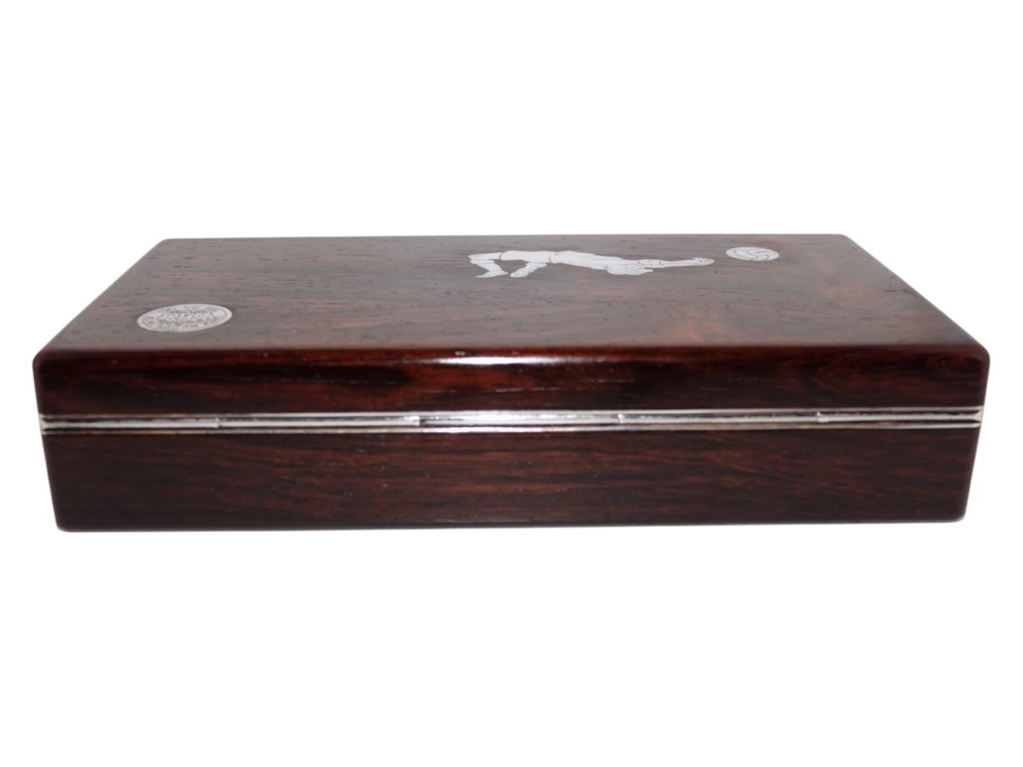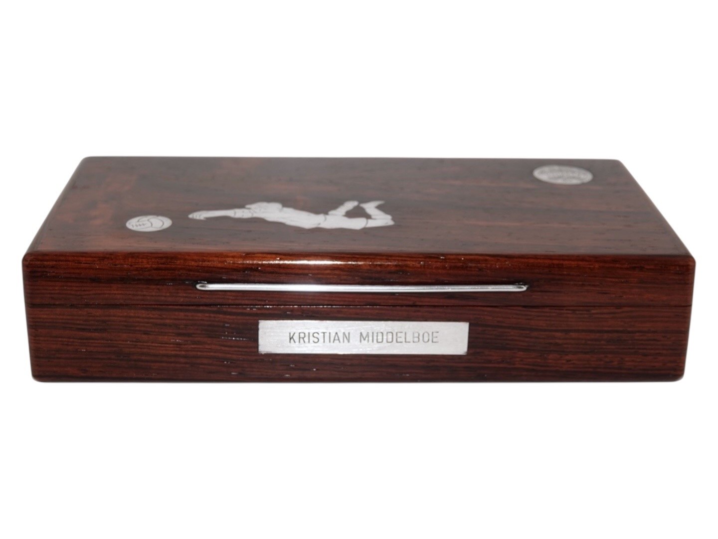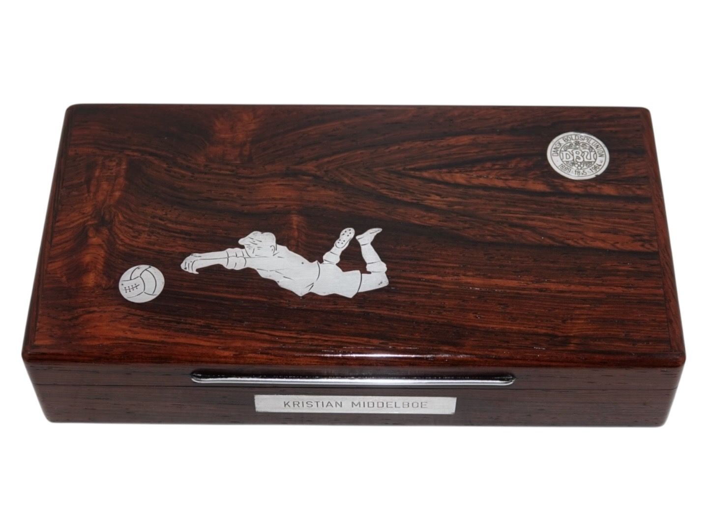 DBU (Dansk Boldspil Union) memorabilia. Palisander æske med indlagt sølv af fodboldspiller og etikette. Æsken er givet til Kristian Middelboe som både var fodboldspiller på landsholdet og senere formand for DBU. Der medfølger en lille udklippet avisartikel. Æsken er fra 1964.