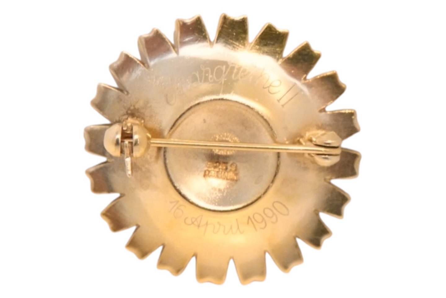Georg Jensen forgyldt sølv Marguerit broche i Dronning Margrethe udgave med inskription på bagsiden: "MARGRETHE 16. APRIL 1990".