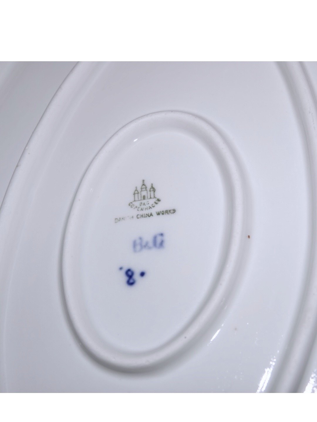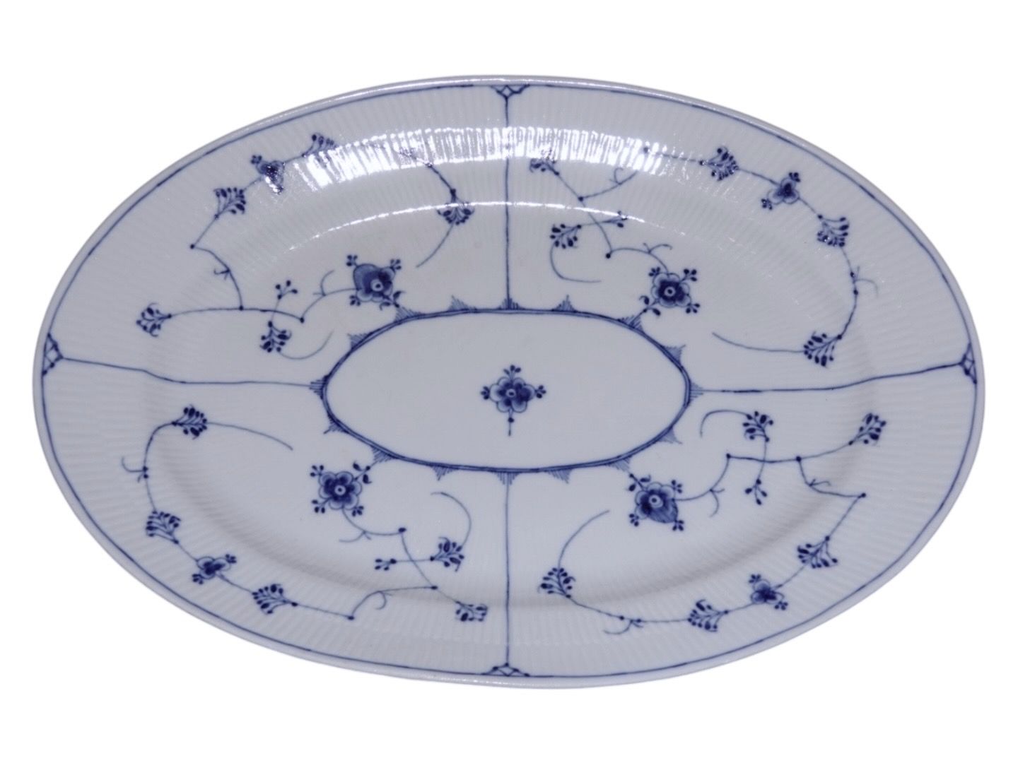 Bing & Grøndahl Blåmalet Riflet (Musselmalet Riflet), stort stegefad. Af fabriksmærket ses det, at denne er produceret mellem 1902 og 1948. 1. sortering. Længde 46,1 cm. Perfekt stand uden fejl.