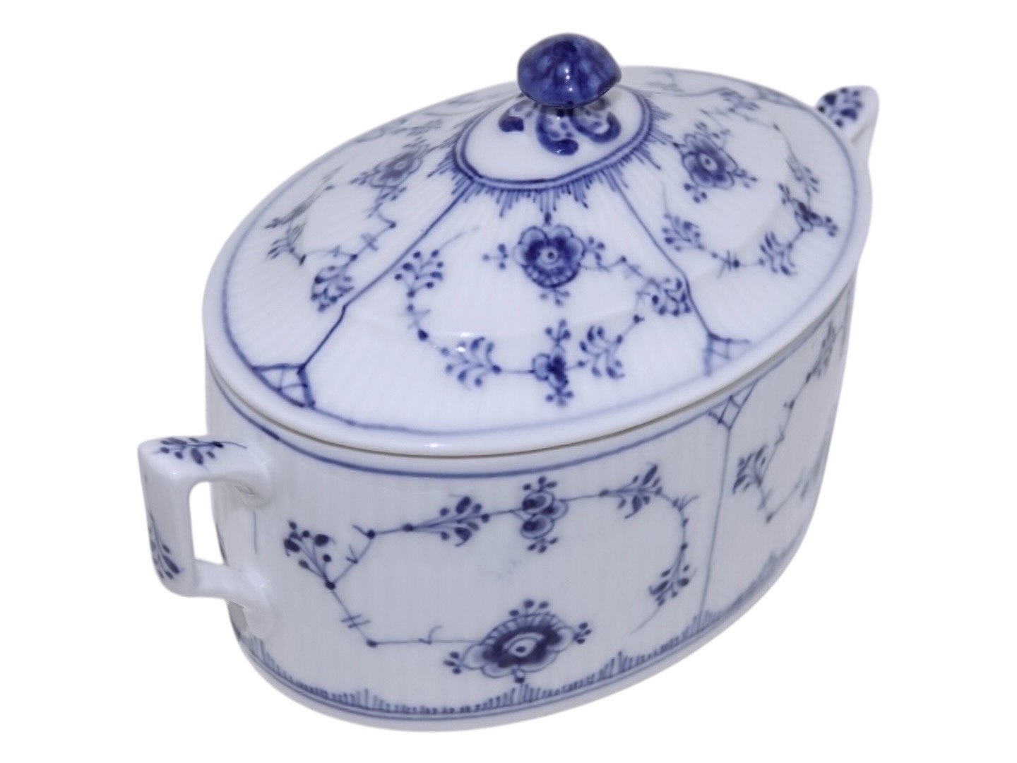 Royal Copenhagen Musselmalet Riflet, sjælden oval sukkerskål med låg.