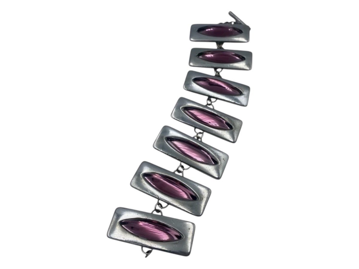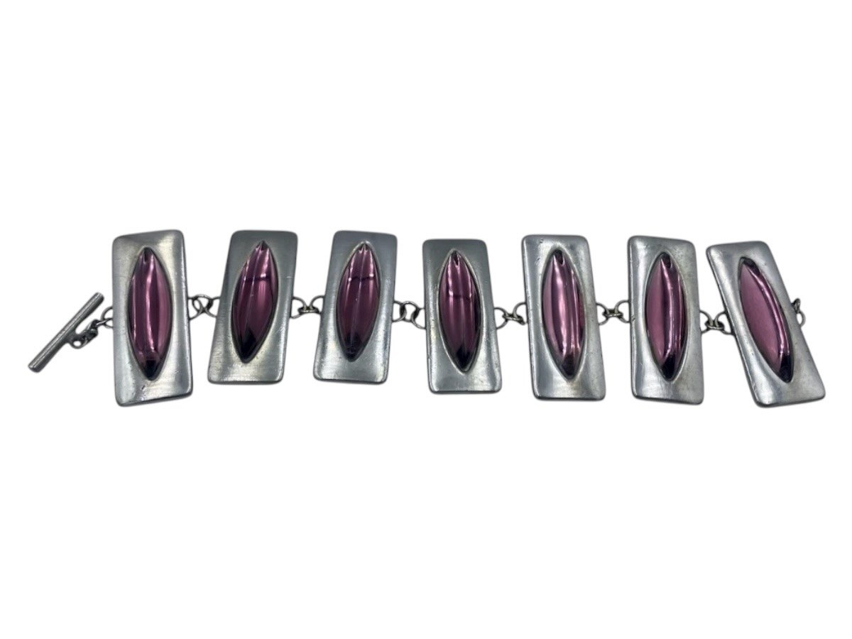 Jørgen Jensen Tin, meget bredt armbånd med lilla glassten. Ustemplet men det designnummeret er 230. Jørgen Jensen døde i 1966. Længde 16,0 cm., bredde 4,0 cm. Der er brugspor men pæn stand.