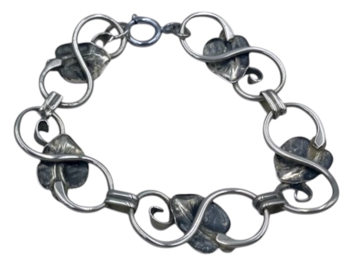 Sølv armbånd med blade fra ca. 1940 til 1960. Et led er formentlig taget af, hvor sølvstemplet har været, så armbåndet er ustemplet, men det er sølv. Længde 17,0 cm., bredde 1,4 cm. Fin og velholdt stand.