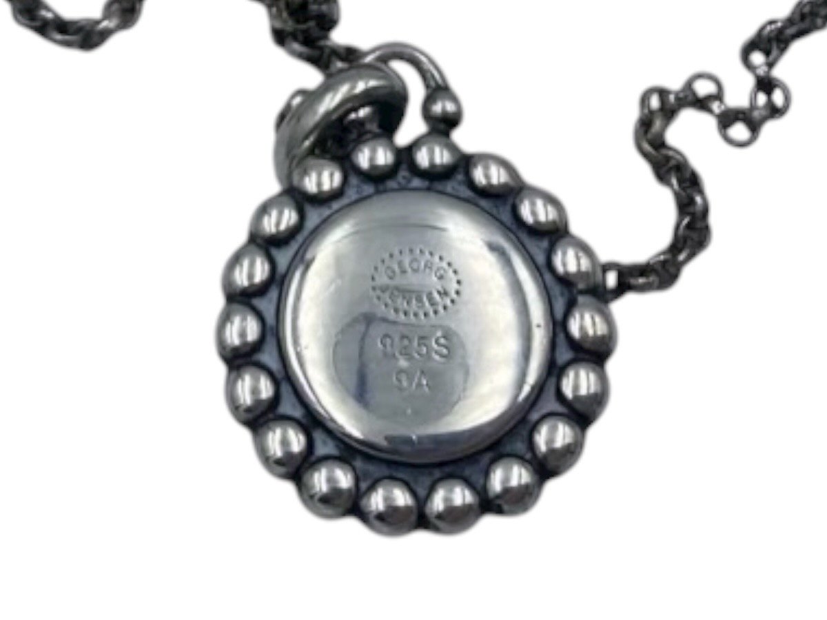 Georg Jensen sterlingsølv, vedhæng med ametyst og halskæde. Designnummer 9A. Kæden måler 46,0 cm., vedhænget måler 1,2 cm. i diameter. Perfekt stand.