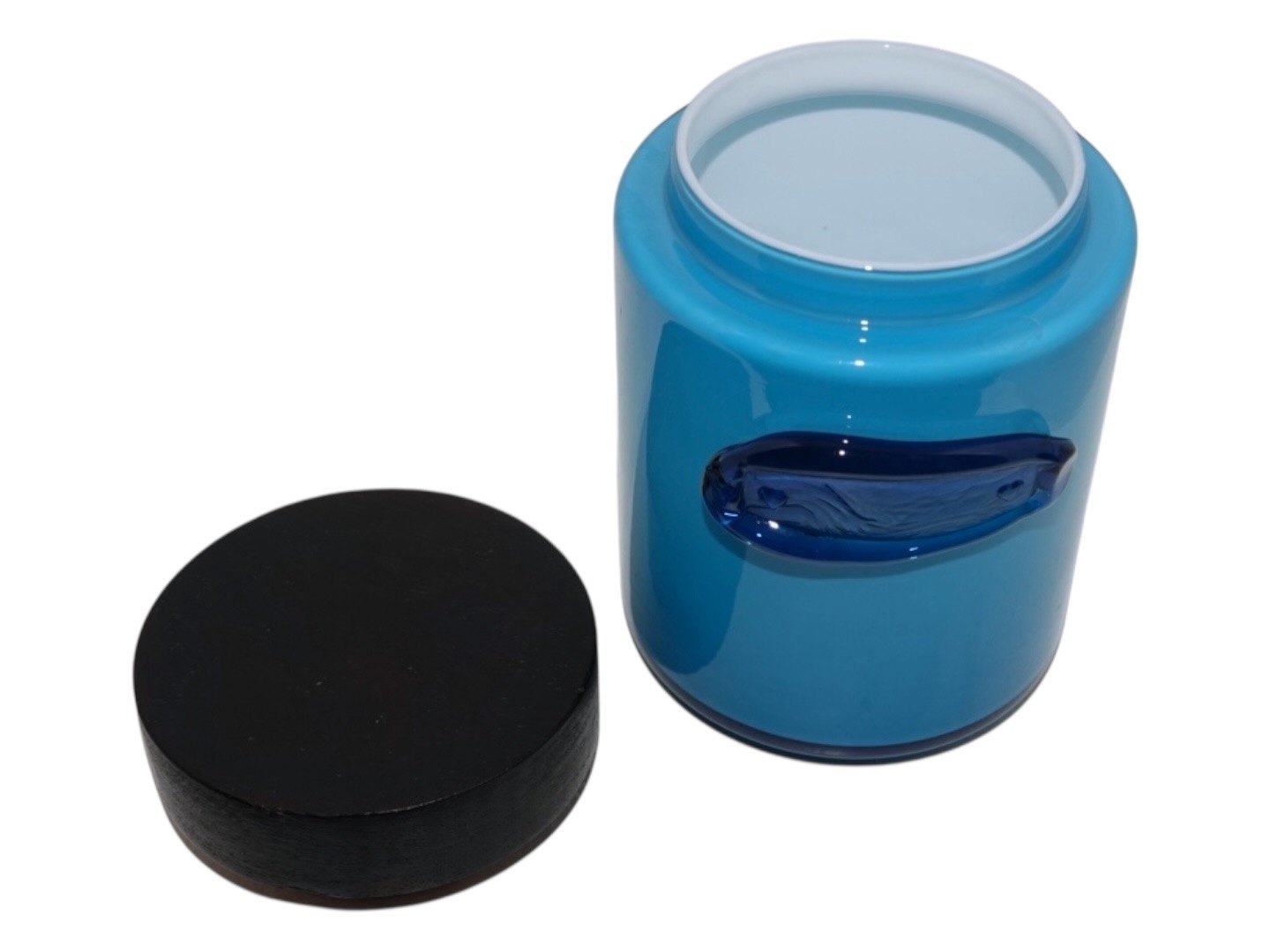 Holmegaard Palet, blå opbevaringskrukke med trælåg uden tekst. Designet af Michael Bang i 1970. Højde 14,3 cm. Perfekt stand uden fejl.