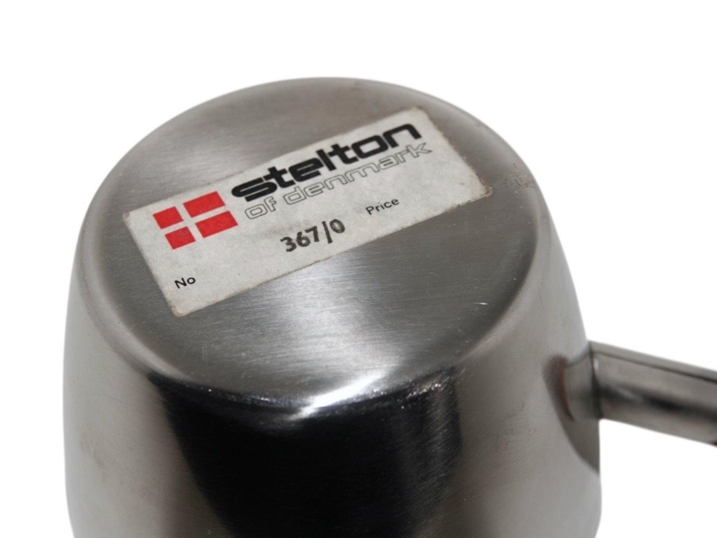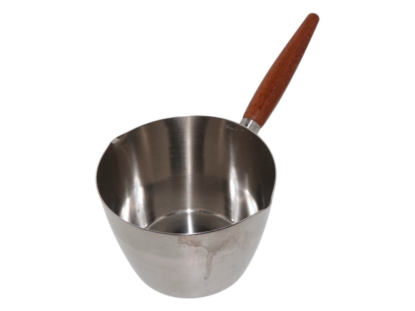 Stelton rustfrit stål, lille sovsekande / smørnæb med håndtag i teaktræ. Længde 19,0 cm. inklusiv håndtag. Fin og velholdt stand.